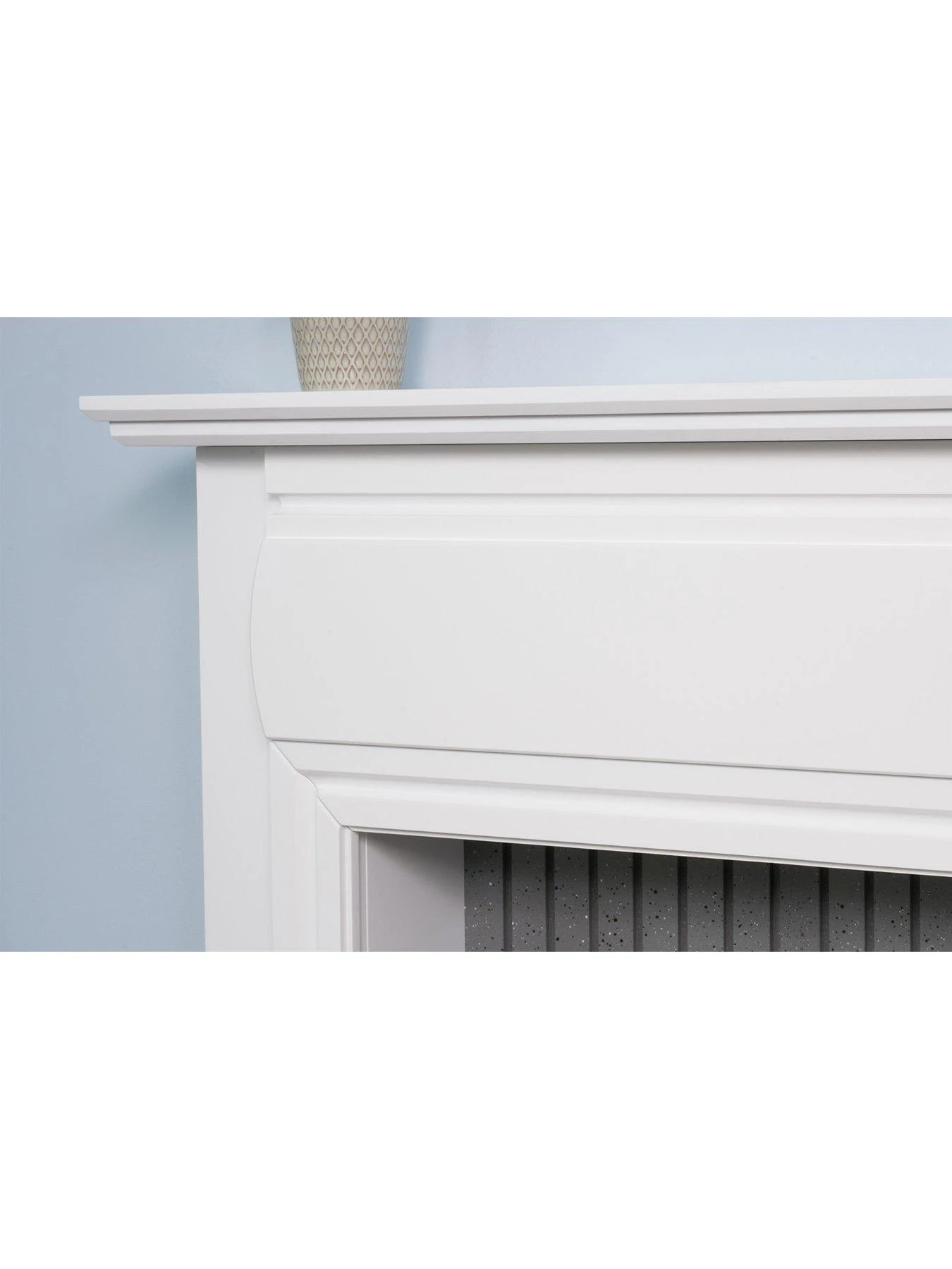 The Adam Florence is a bright and boisterous fireplace suite. With its vivacious, pure white finish and grey back panel the surround is combined with the Adam Aviemore electric stove in white and white stove pipe, creating a fireplace package that can’t help but impress.