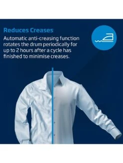 - Automatic Anti-creasing Function – Rotates the drum periodically for up to 2 hours after a cycle has finished, separating your laundry to minimise cre