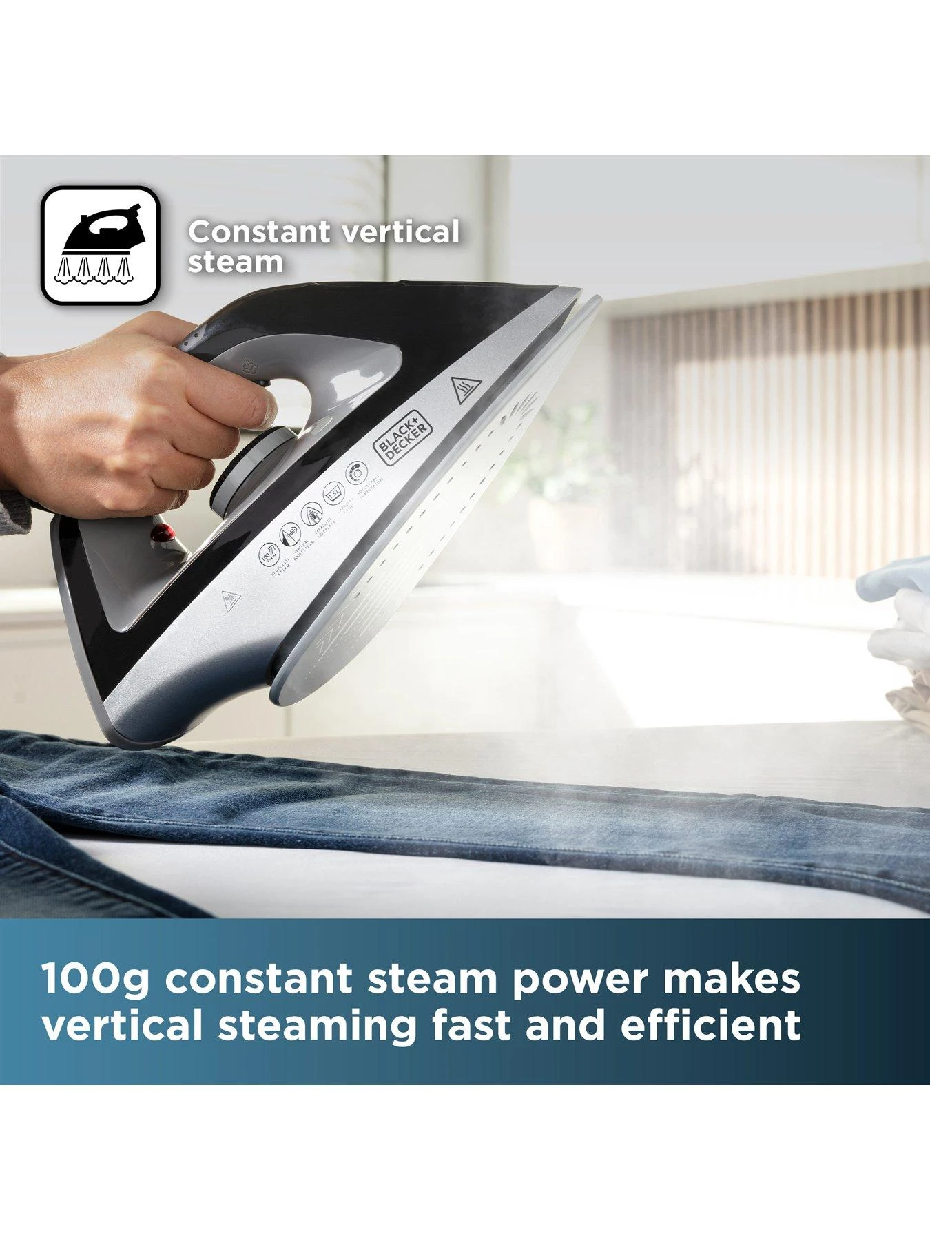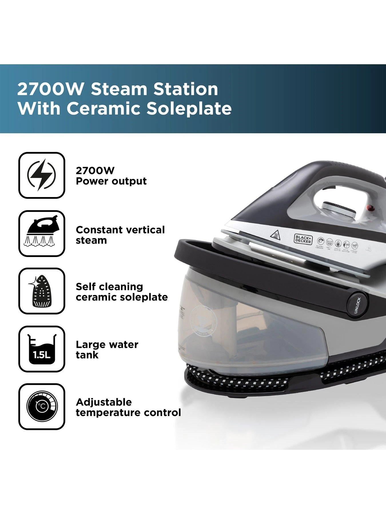 Glide through your ironing pile with the smooth ceramic soleplate of the BLACK+DECKER 2700W Steam Station. Heating up in less than 60 seconds with 100g continuous steam and 3 bar pressure steam station, you can get a head start on your laundry.
