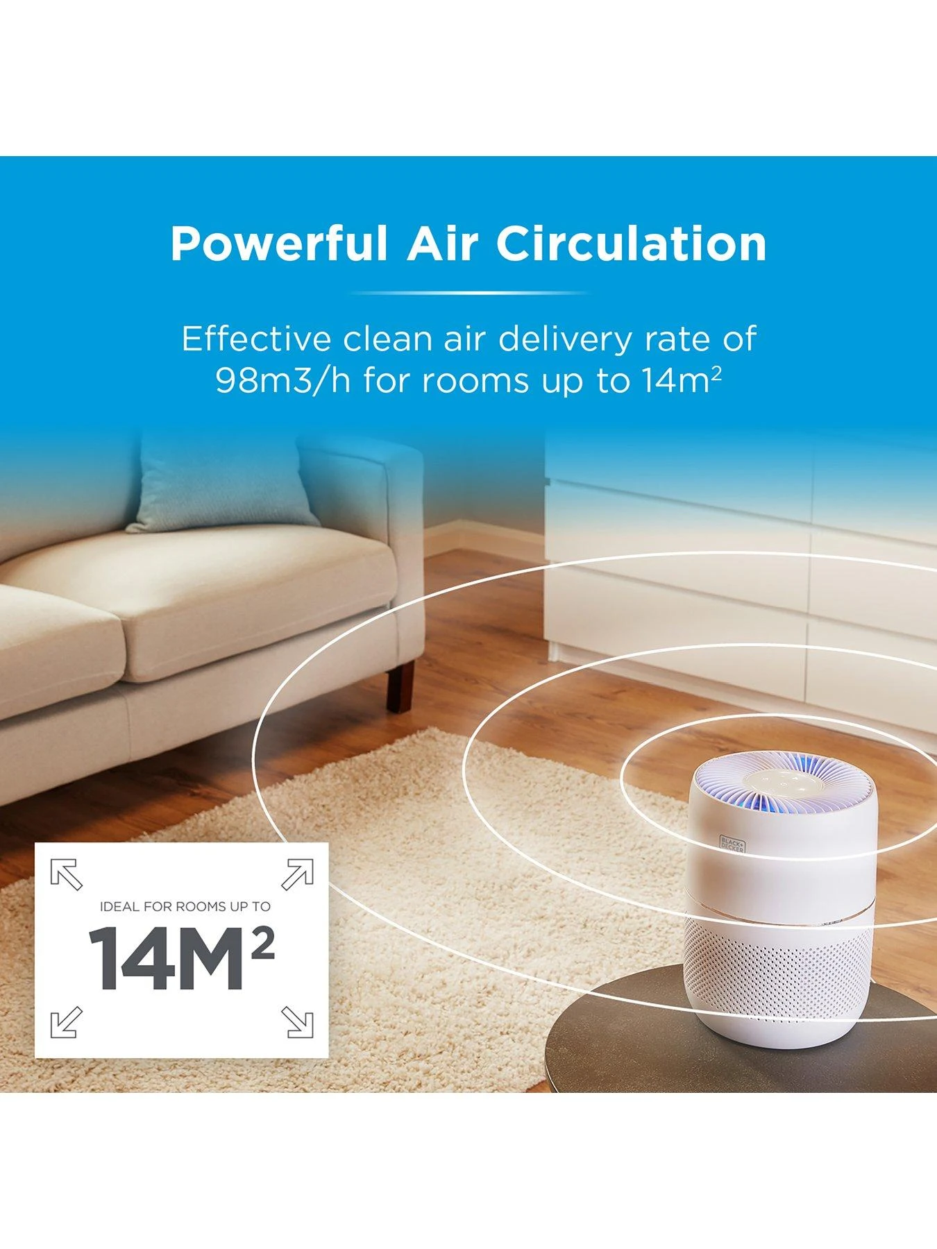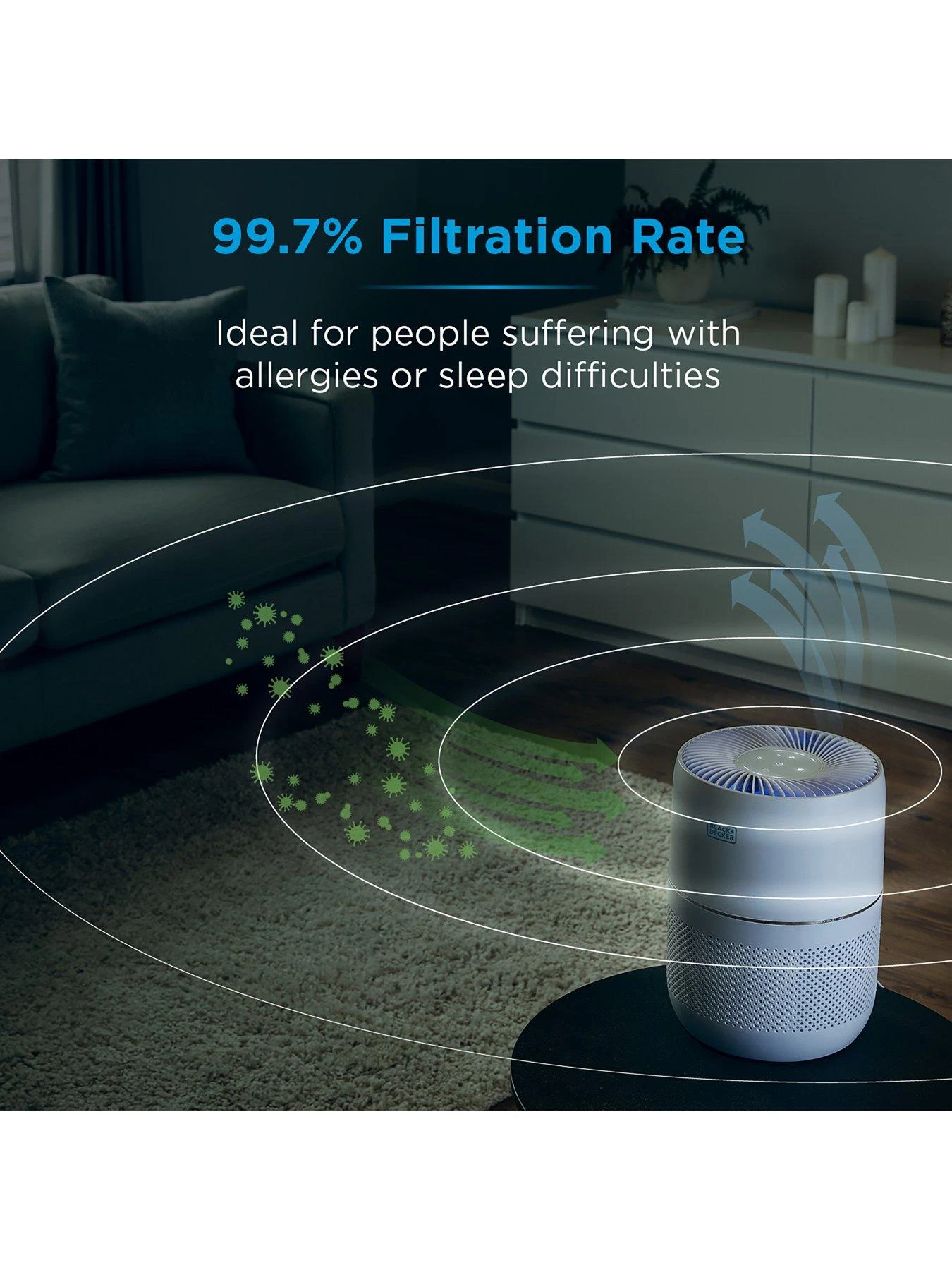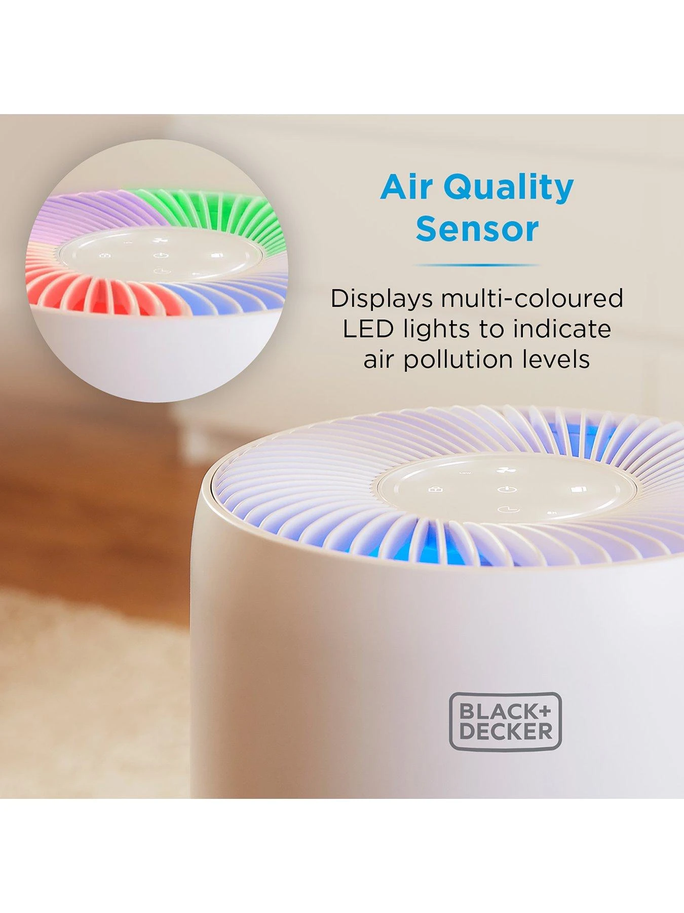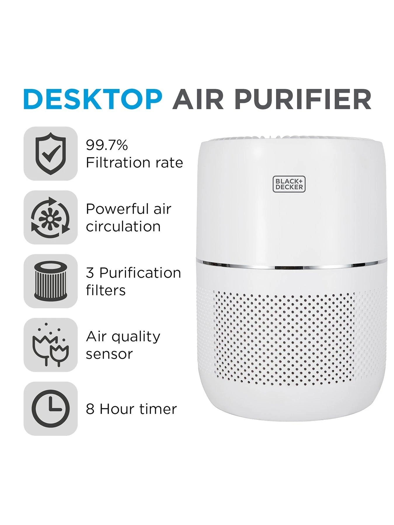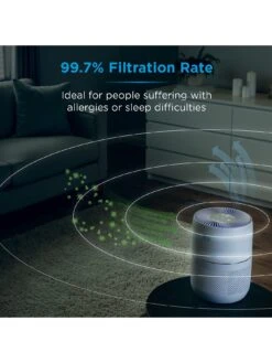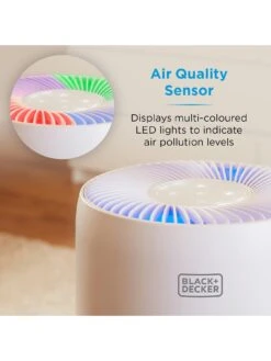 Keep the air quality of your home clean and healthy all year round with this Black + Decker desktop air purifier. The included HEPA13 filter has a 2200 hour lifespan and removes 99.7% of the finer particles such as allergens and germs, helping provide the room with a cleaner and overall healthier airflow.