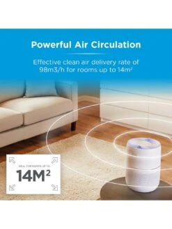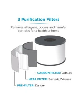 There are three different purification filters at work, including a pre-filter that captures large particles of dust/pet dander; a carbon filter that removes gases like odours for refreshing clean air and an anti-bacterial filter to remove any harmful particles for a healthier environment. A handy reminder will let you know when it’s time to change the filter.