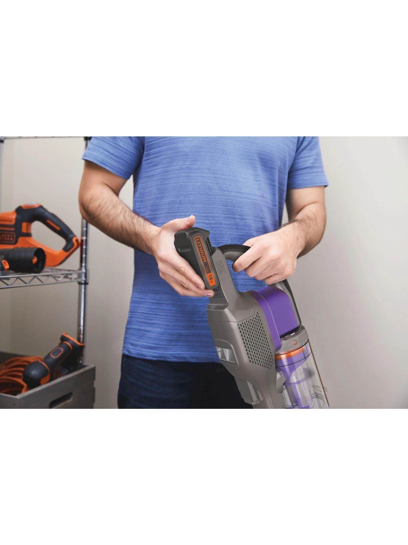 With up to 58 minutes runtime on a single charge the BLACK+DECKER 18V POWERSERIES Extreme stick vac is engineered to help get jobs done quickly, easily and efficiently. This 4-in-1 stick vac has a powered anti-tangle beater bar that gives you a deep and powerful clean with less than 5% hair wrap and with up to 70% more pick up on carpet*, leaving your home spotless. Ideal for pet owners, get rid of that dog and cat hair with ease with the pet brush. The three-speed settings allow you to vary your speed to suit the job at hand, use the high speed setting for a maximum deep clean, perfect for carpet. The transparent easy empty bowl allows you to pop the dirt out in one easy move keeping your hands clean of dust and debris. Part of the BLACK+DECKER 18V battery platform, allowing you to use the battery across other 18V BLACK+DECKER tools. *compared to the BLACK+DECKER 18V MULTIPOWER vacuum cleaner