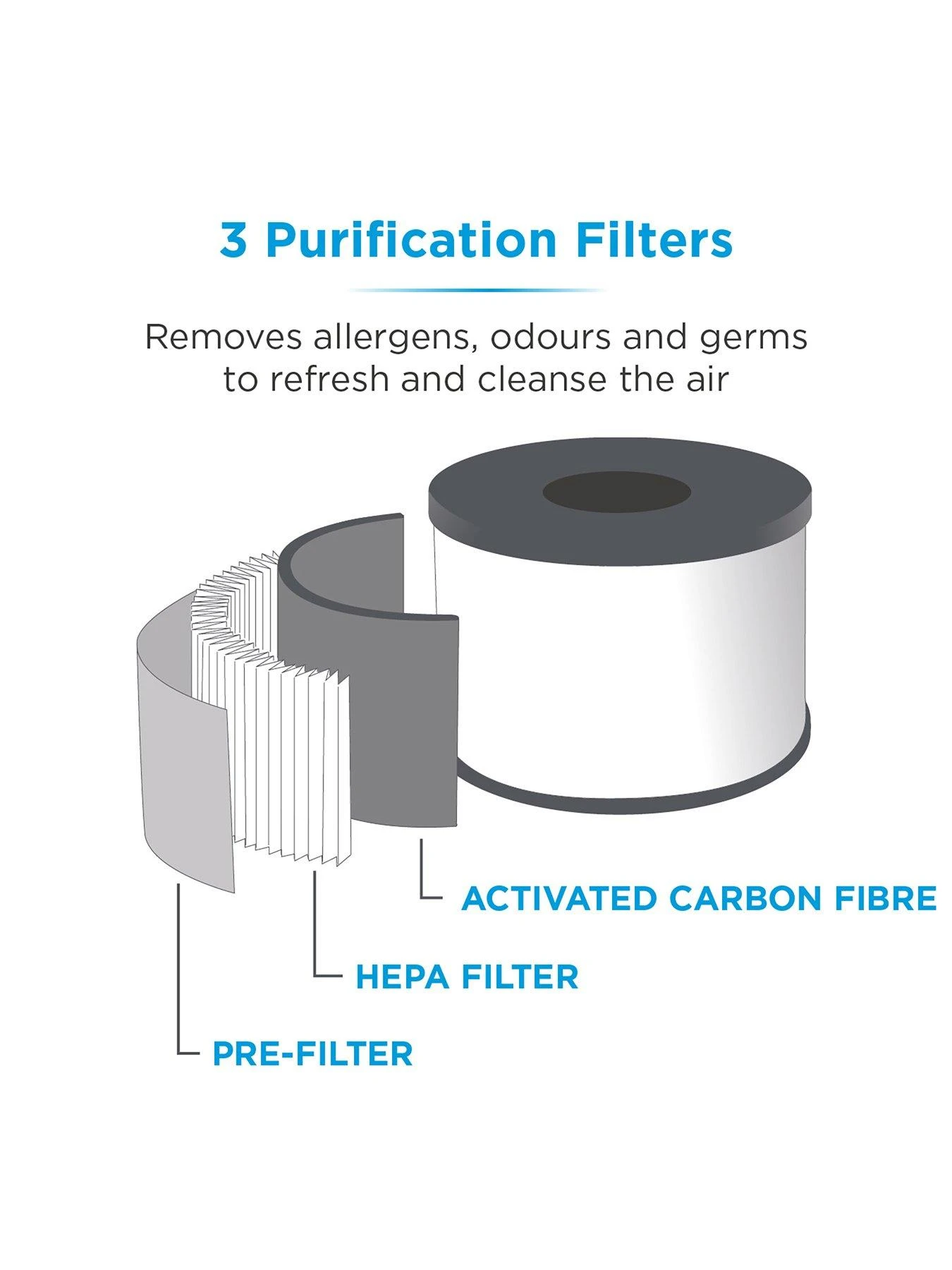 - 3 AIR PURIFICATION FILTERS: Captures dust, pet hair and pollen to improve allergies while eliminating germs and odours