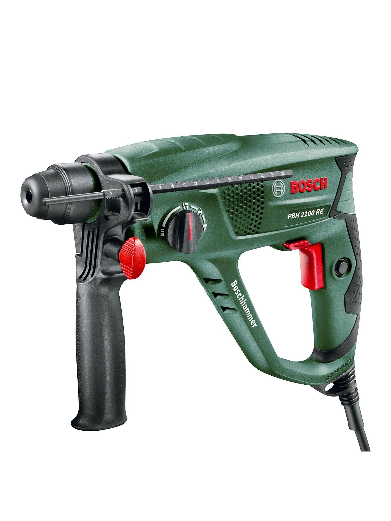 The Bosch PBH 2100 RE rotary hammer is a handy and powerful tool for all common hammering, drilling or chiselling jobs. A high impact force is provided by its 550 watts of power and its pneumatic Bosch hammer mechanism with a single impact energy of 1.7 joules so it drills through the hardest materials, regardless of the pressure applied. The PBH 2100 RE is also exceptionally lightweight (2.2kg) and compact with softgrip coverings to help you work comfortably for longer.