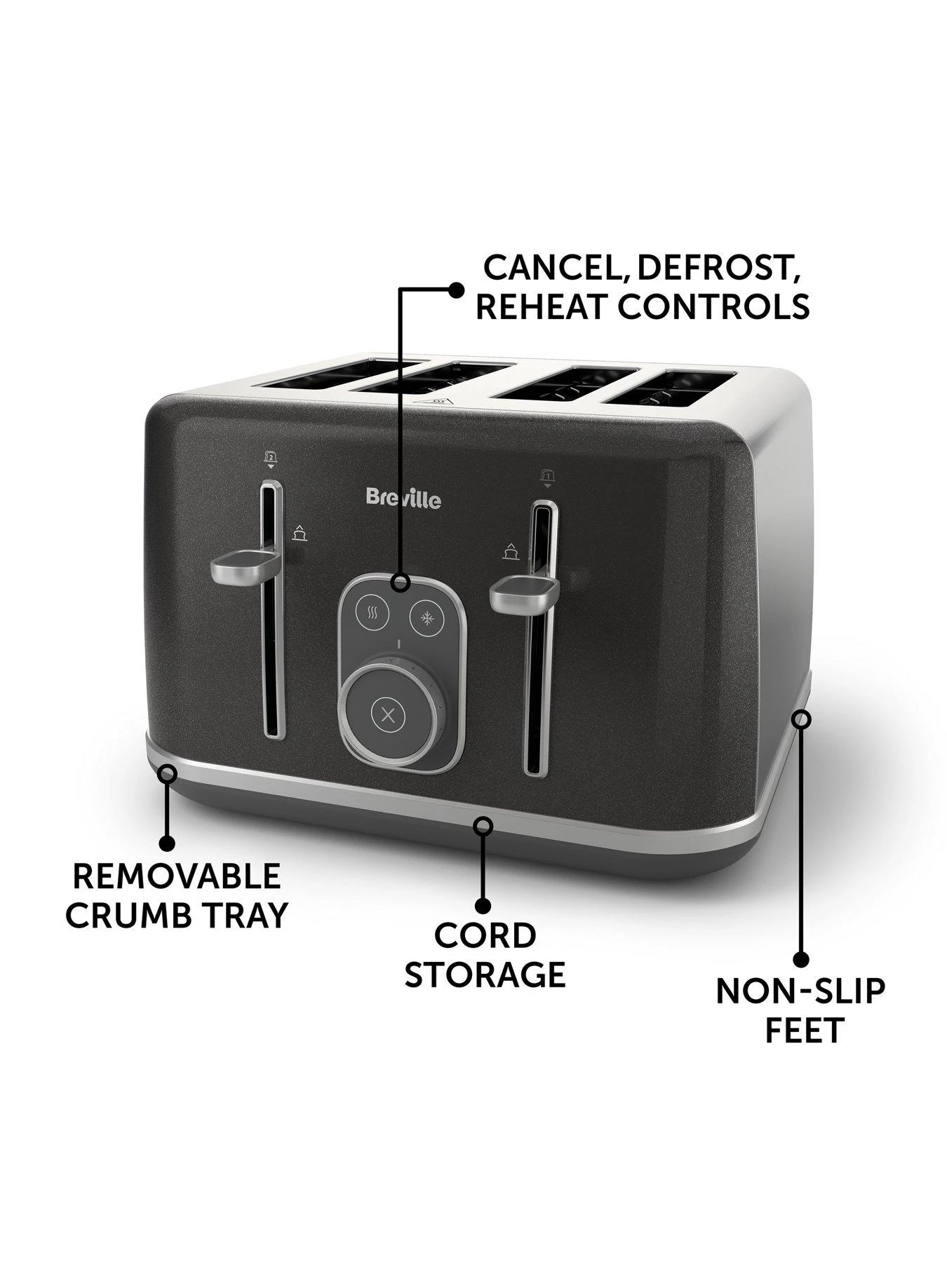- Defrost, reheat and mid-cycle cancel functions, plus removable crumb tray, non-slip base and cord storage