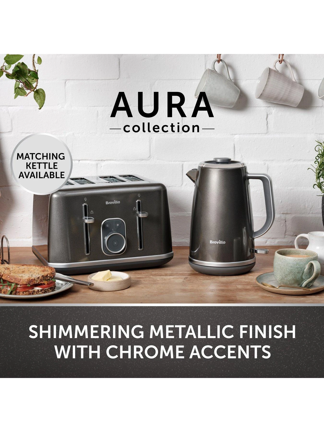 Take mixed metals to the next level with the Breville Aura Collection. The shimmering metallic finish with contemporary chrome accents perfectly complements your kitchen space. This Breville toaster also handles the basics with ease. View your toast’s progress mid-cycle with Lift & Look, and remove smaller slices without burning fingers with the High Lift facility. The variable width slots accommodate different bread sizes, crumpets and bagels, while the variable browning controls ensure every slice is just the way you like it. A removable crumb tray and cord storage helps keep your worktop clean and tidy.