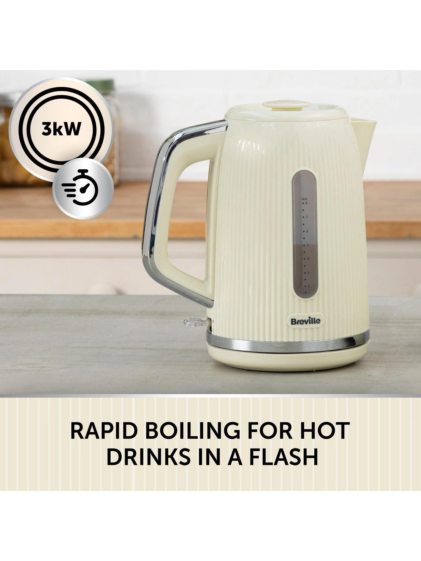 - 3kW concealed element for rapid boiling; Capacity makes 6 to 8 cups.