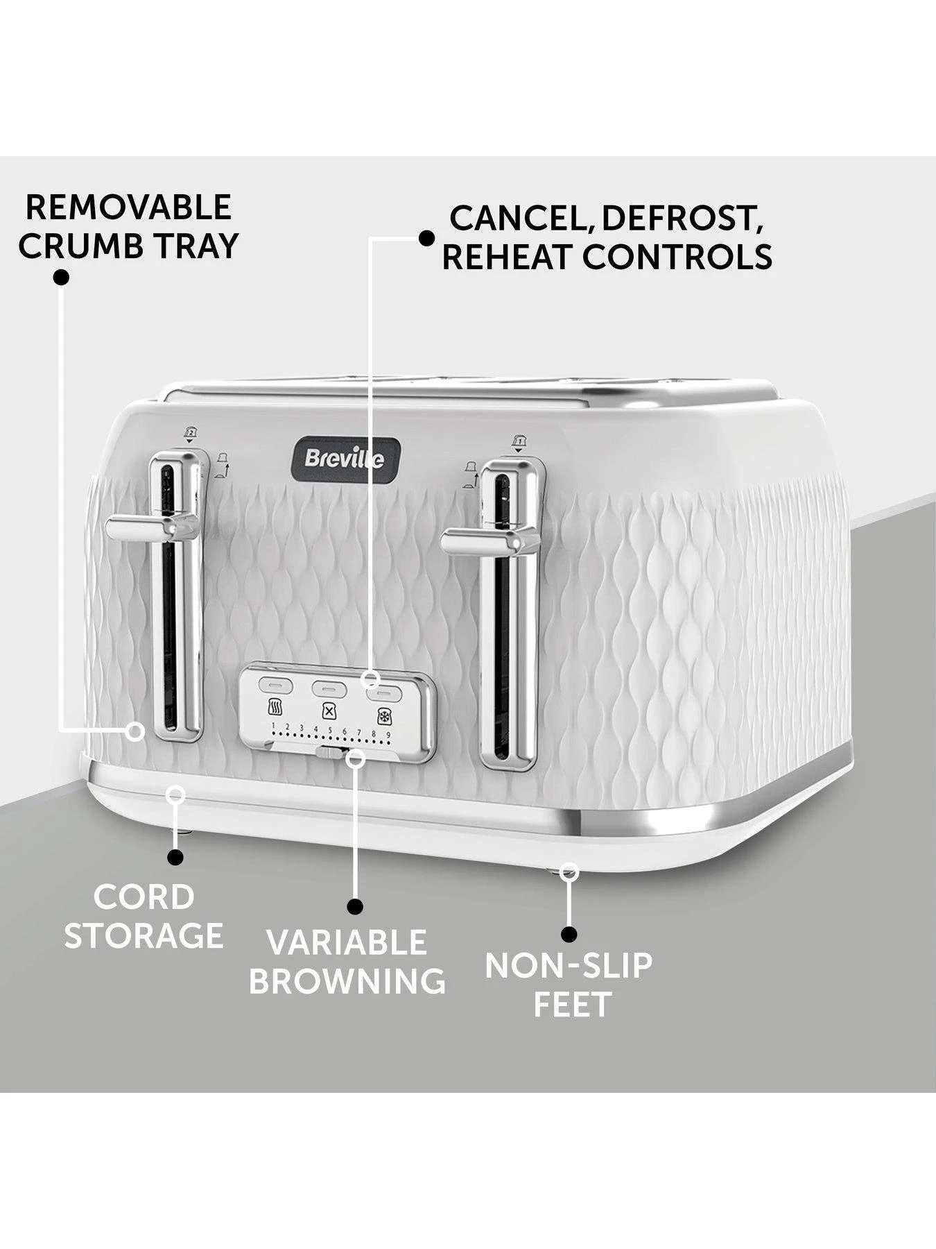 Eye-catching on any kitchen countertop, the Breville Curve 4-Slice Toaster is both stylish and functional. It has a unique curved texture design with high gloss finish and chrome accents for a premium look.