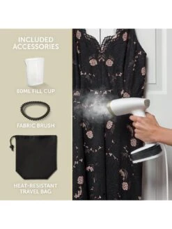 - Includes: fabric brush, 80ml fill cup, heat-resistant travel bag, 3m power cord