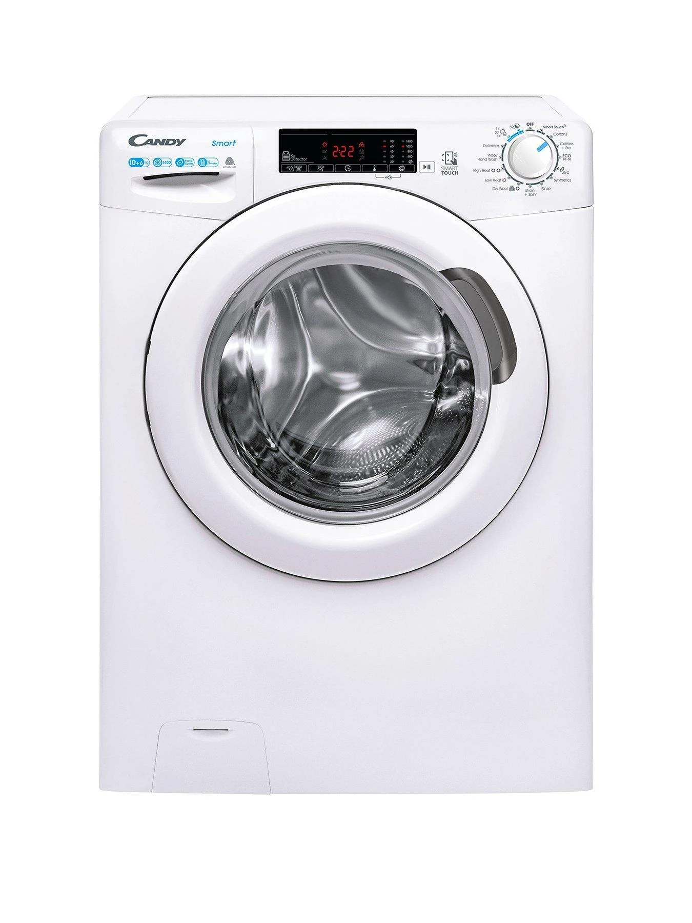 This Candy washer dryer from the Smart range has a 10kg wash and a 6kg dry load capacity, as well as a 1400 spin speed. There are 15 programmes to choose from, with 4 rapid wash options under an hour, including a full load in 59 minutes. KG mode automatically weighs the load during the first four minutes and adjusts the length of the programme and the water consumption accordingly.