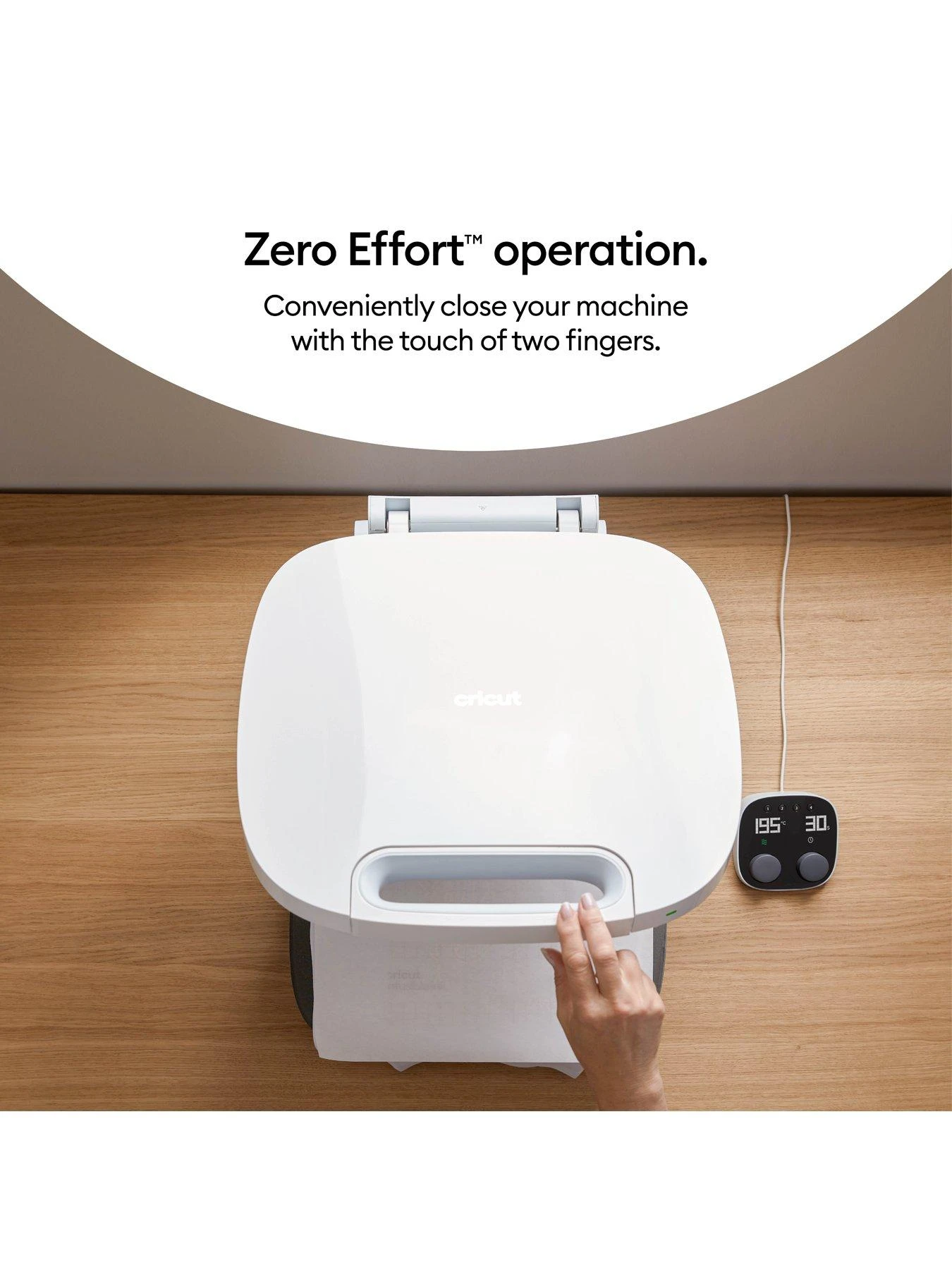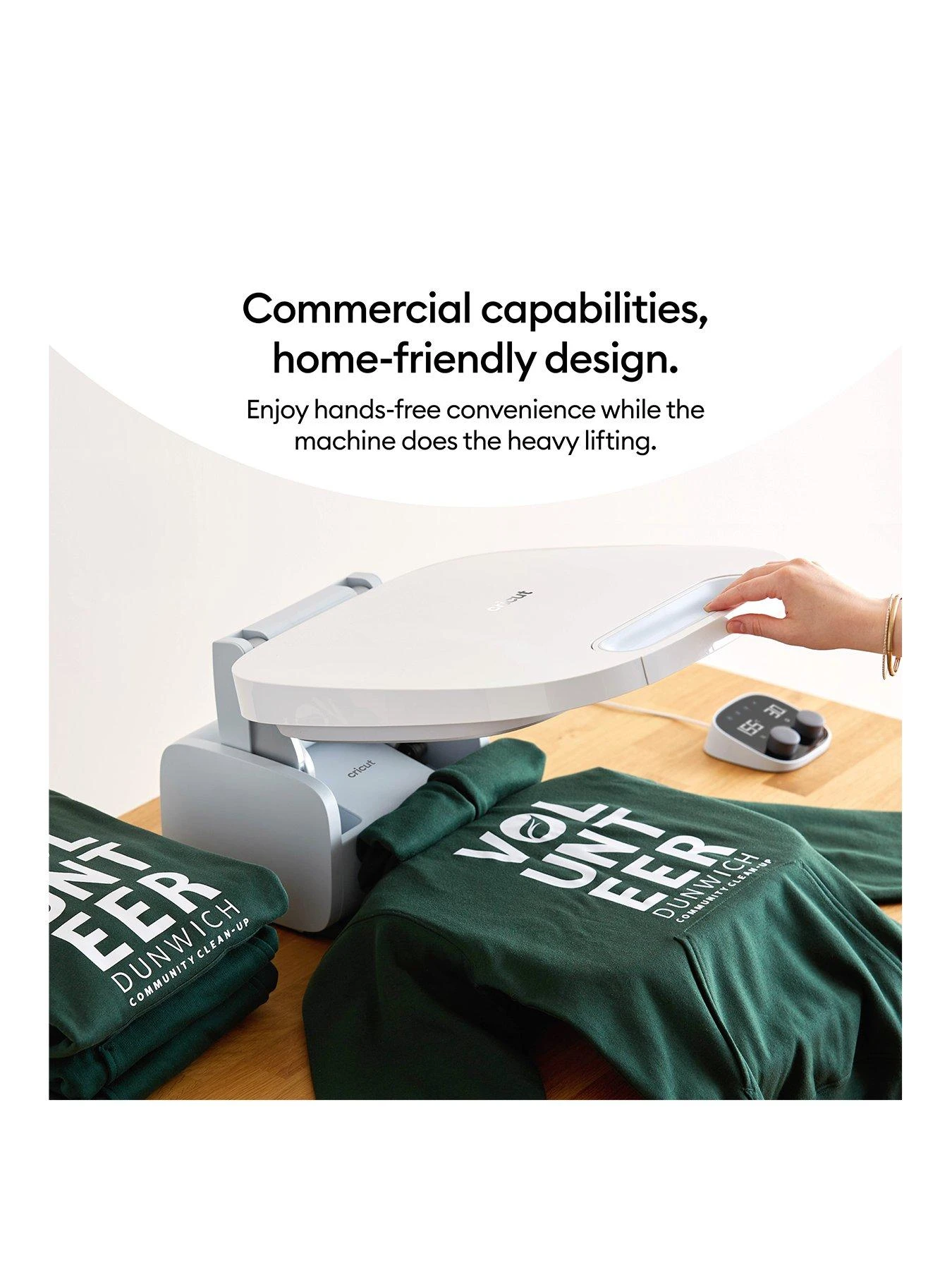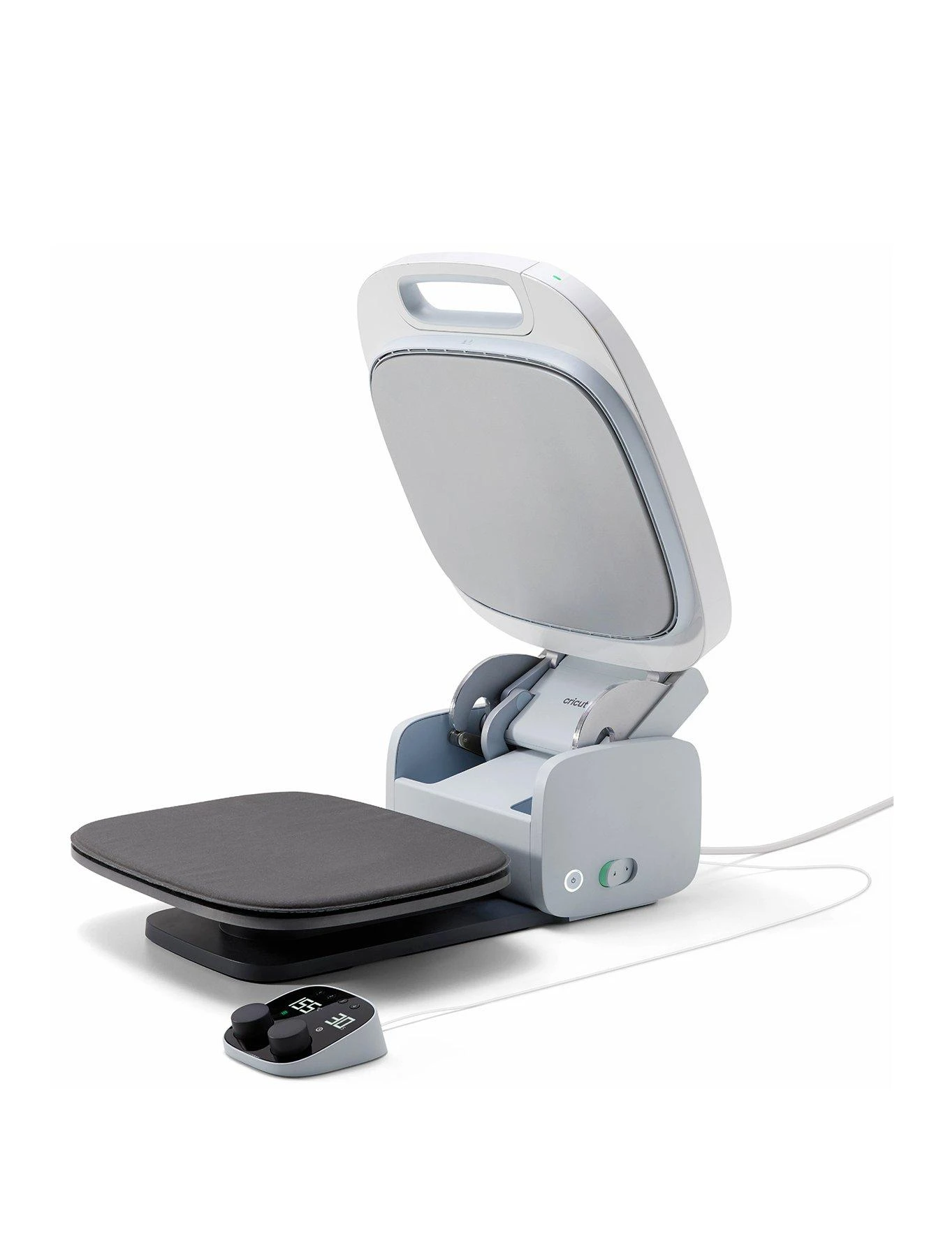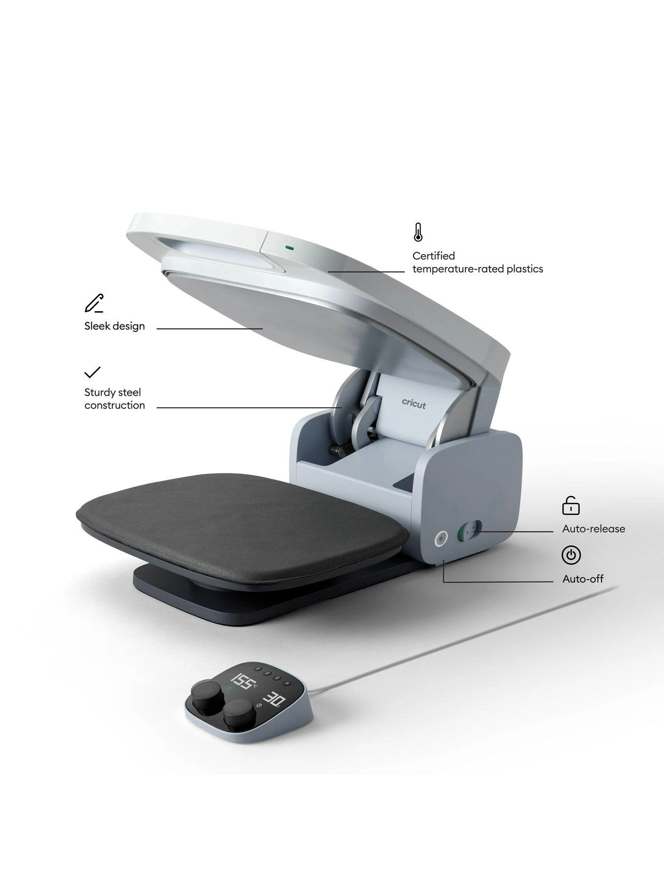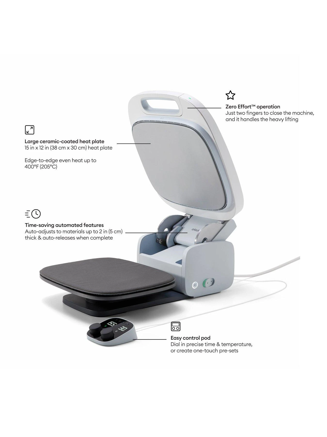 Make more in less time with the professional heat press for home. Cricut Autopress combines commercial power with a sleek, user-friendly design to take on any heat transfer project. Zero Effort operation lets you securely close the machine with just two fingers, and the handle’s motor does the rest. Use the control pod to dial in precise time & temperature settings for consistent results on your creation, whether it’s a big-business production or a one-time passion project. The ceramic-coated heat plate reaches up to 400ºF (205ºC) for a large variety of heat-transfer applications and auto-adjusts to materials up to 2 in (5 cm) thick – that means no more pressure adjustments. Safety features like auto-off & certified temperature-rated plastics mean you can press with peace of mind. It even auto-releases when the press is complete. Works with major brands of iron-on (HTV), Infusible Ink & sublimation materials. A perfect complement to Cricut cutting machines.