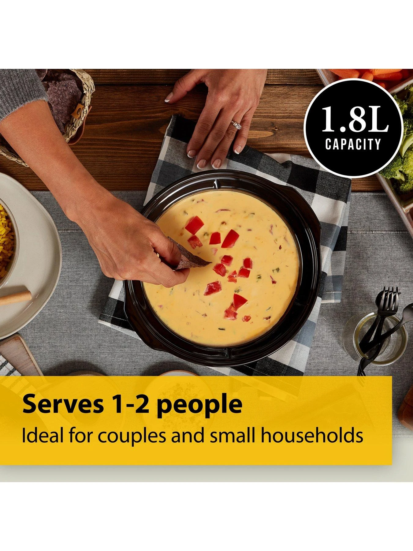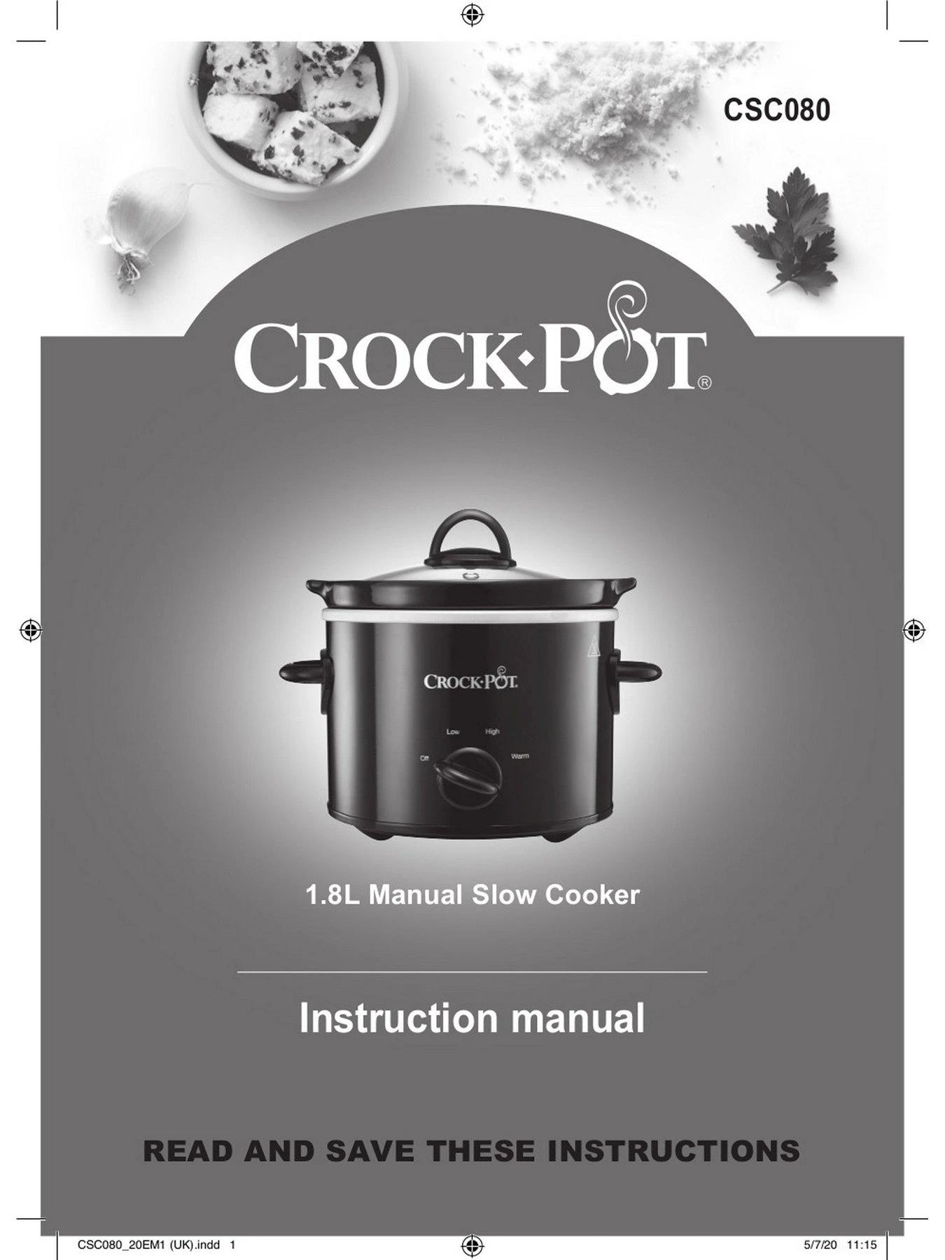 Create tasty home-cooked meals with this Crockpot 1.8 Litre Slow Cooker. The 1.8 litre capacity is the ideal size for couples and individuals and with some quick prep in the morning, you can enjoy a flavoursome homemade meal in the evening: from casseroles and soups to tasty tagines, indulgent chocolate pudding and much more. The oven safe bowl is ideal for putting in the oven after slow cooking to brown meats or cheese topped dishes to get the perfect finish. After cooking, the removable stoneware pot can also be taken straight to the table for serving, and if you have leftovers, it can be stored in the fridge or freezer. For added versatility the pot is oven-safe and both the pot and removable lid are dishwasher-safe for easy cleaning. A selection of recipes is included to get you started along with a few handy slow cooking hints & tips.