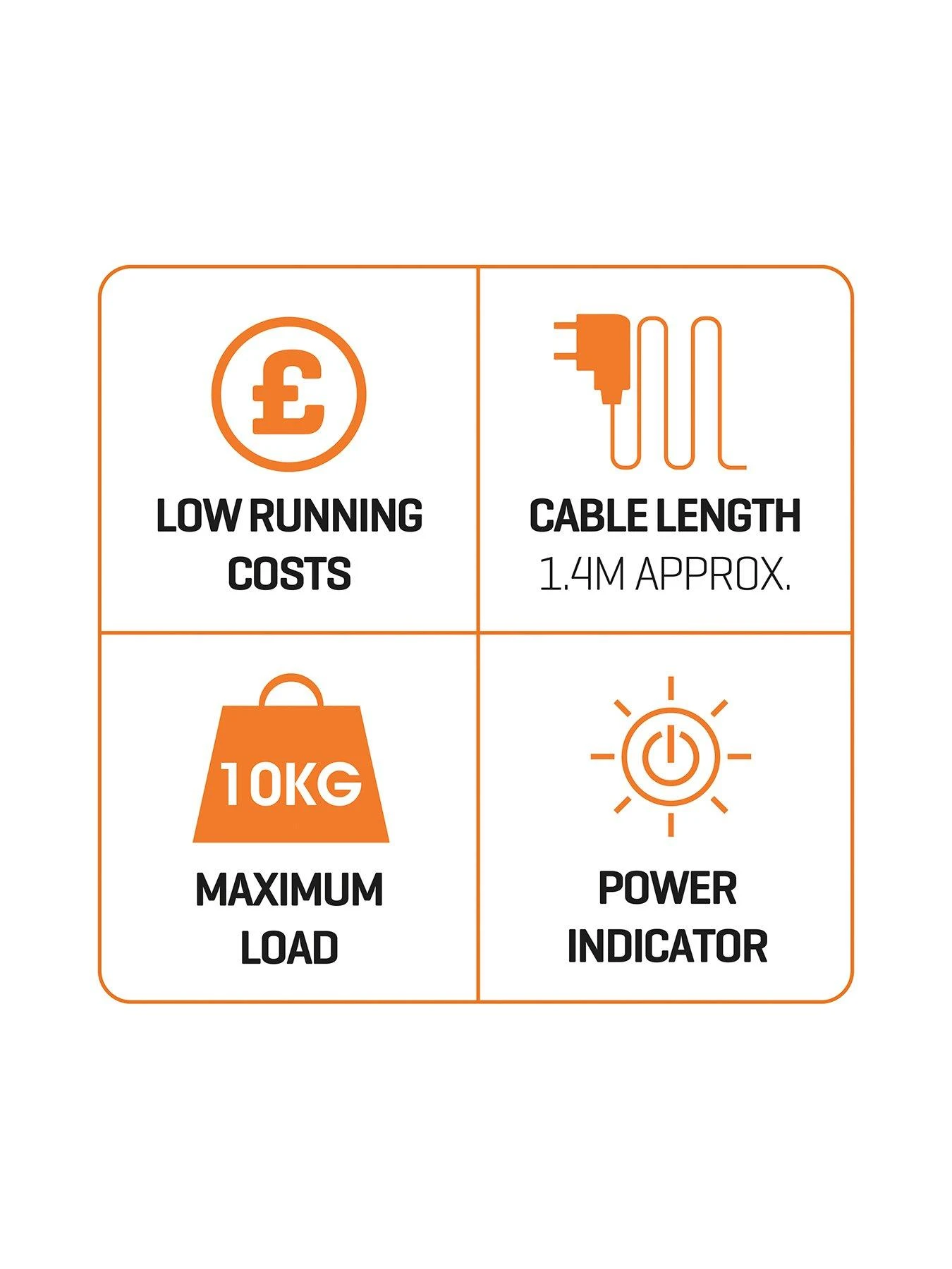 The 1.4m cable gives you plenty of room to manoeuvre. Low Running Costs mean it’s ideal for the cooler months.