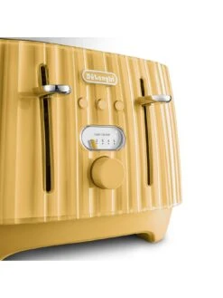 With its shiny Gold Yellow finish reminiscent of Ventian glasswork. and sleek chrome detailing, this Delonghi toaster is sure to to spark inspiration and creativity in your breakfast routine. With space to toast 4 slices at the same time, this toaster comes with progressive browning controls, as well as reheat and defrost options.