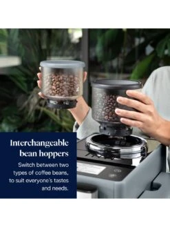 - Twice as Nice! Two bean hoppers allow you to effortlessly switch between two types of roasts or say decaf & caffeinated beans