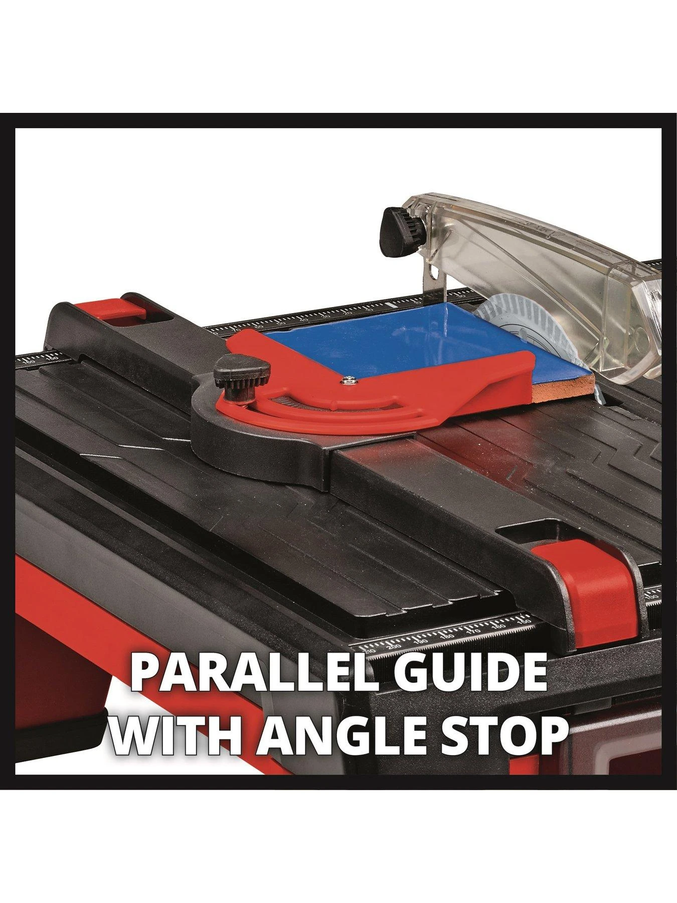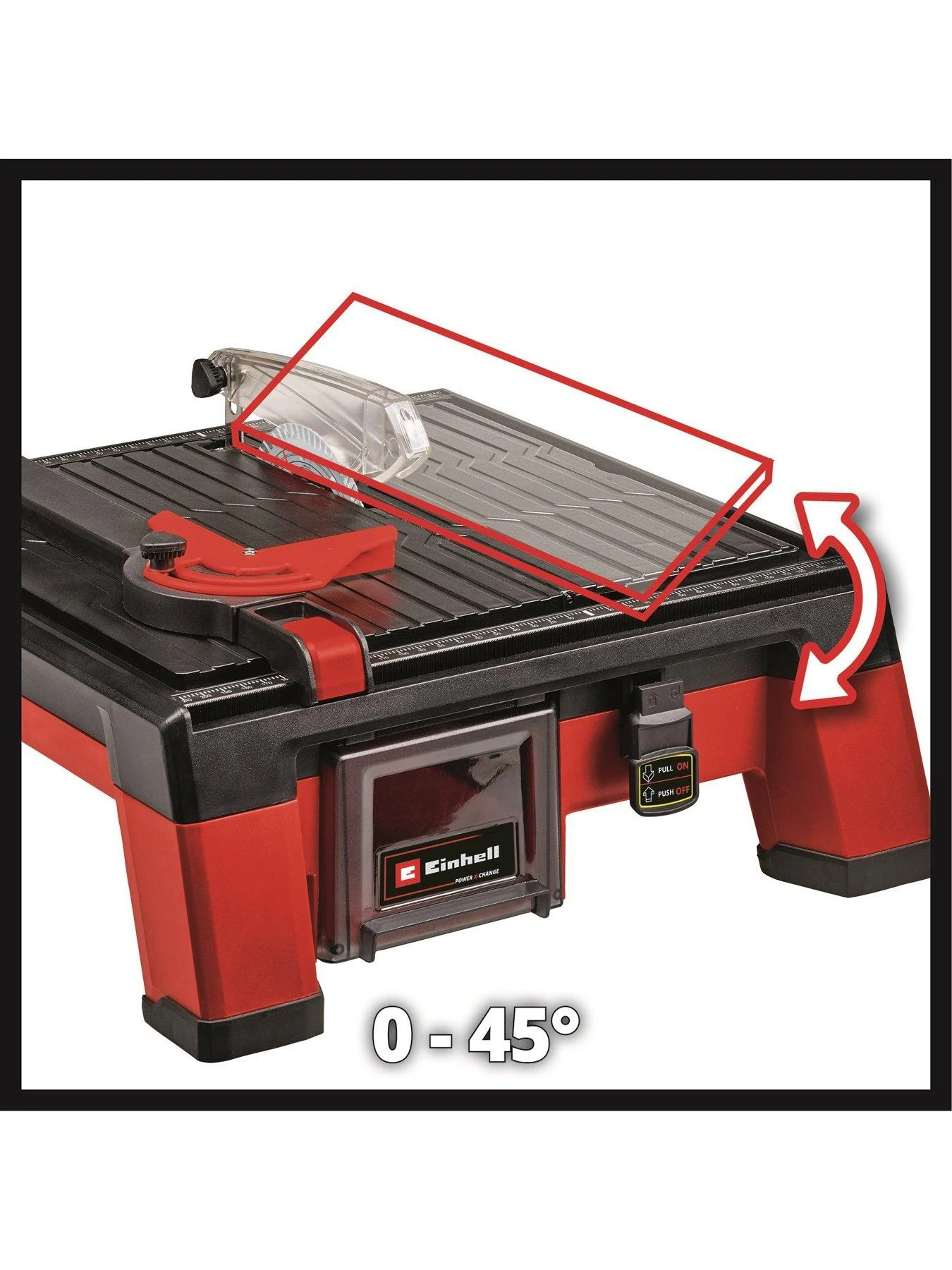 The tile-cutting machine has a parallel stop with a scale and a table which can be tilted at an angle scale from 0° to 45°. The adjustable angle stop has settings from -45° to +45° for mitre cuts.
