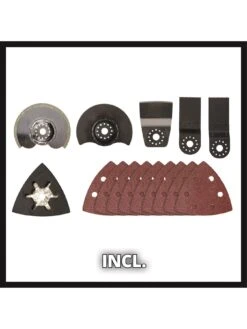 Supplied with a delta grinding/sanding plate, 9 sheets of abrasive paper (3*P60/3*P80/3*P120), scraper, plunge-cut blade for wood and plastic (HCS) and one for metal (BIM), a segment saw blade for wood, plastic and soft metal (HSS) and a diamond one for tile joints.