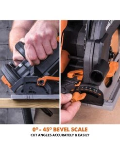 The Evolution R185CCSX circular track saw is perfect for trade or DIY users thanks to its powerful 1600 W motor and optimised gearbox that when combined with the Evolution R185TCT-16CS blade (supplied) can cut a variety of materials such as mild steel, aluminium, wood (even with embedded nails), plastic, copper, PVC and more. When cutting mild steel the saw produces a square, ready-to-weld cut with no heat, no burrs and virtually no sparks, far superior to abrasive cutting methods. The saw features an adjustable depth of cut from 0-64mm and 0-45 ° bevel capabilities for versatile cutting in any material.
