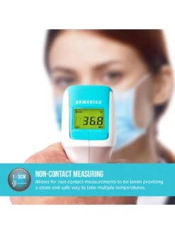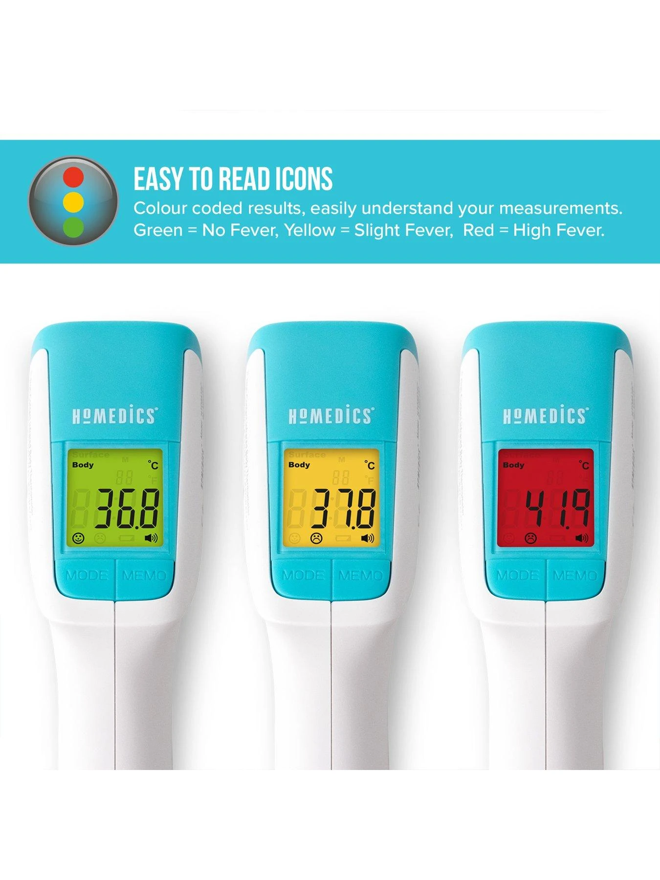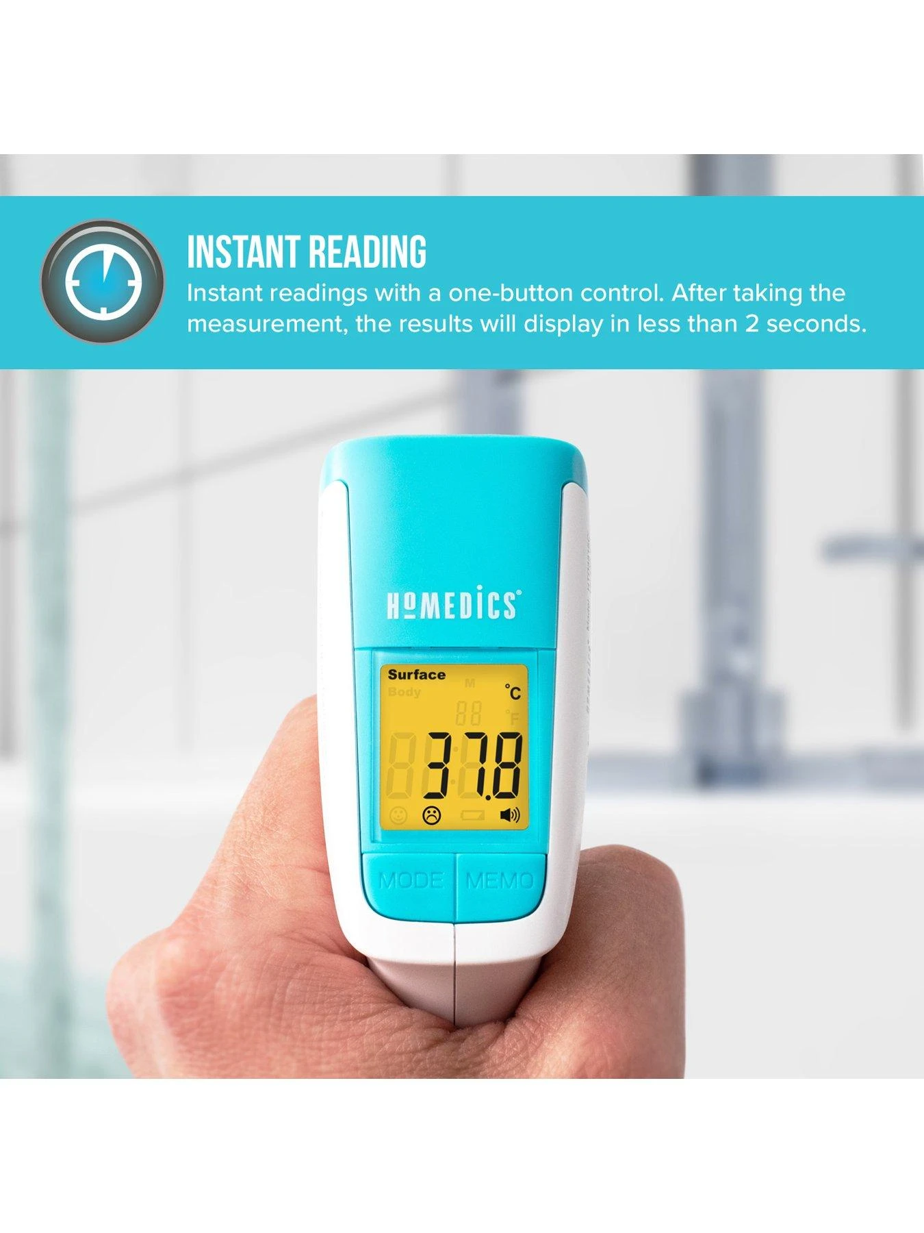 The HoMedics Non-Contact Infrared Body Thermometer allows for a non-invasive and non-contact temperature reading. Simply align the thermometer with the middle of the forehead and press the scan button to take a temperature measurement.