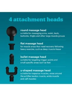 - 4 attachment heads (ball, fork, bullet and flat) designed for different muscle areas