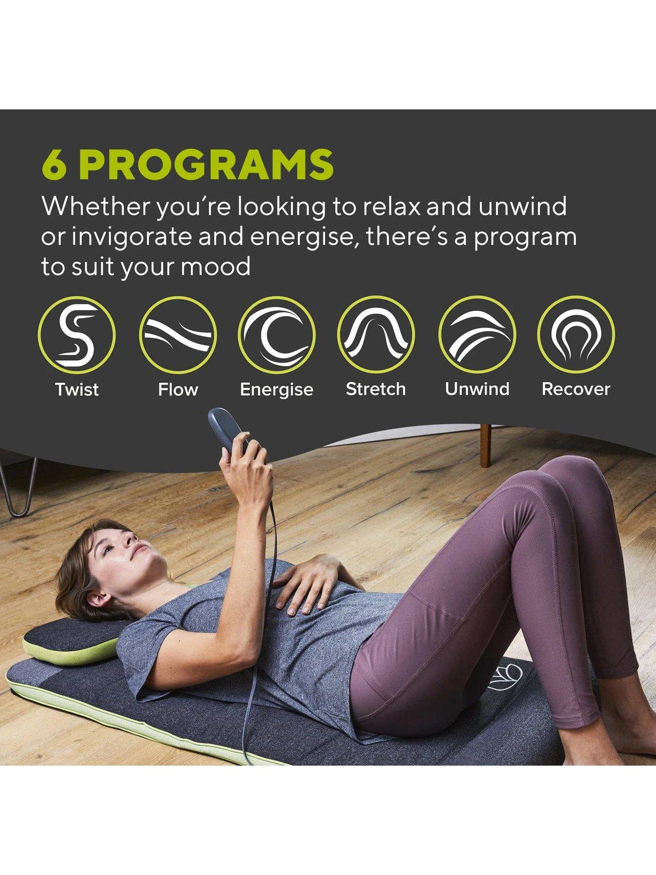 - Choice of 6 programmes: Unwind, Recover, Stretch, Twist, Energise and Flow
