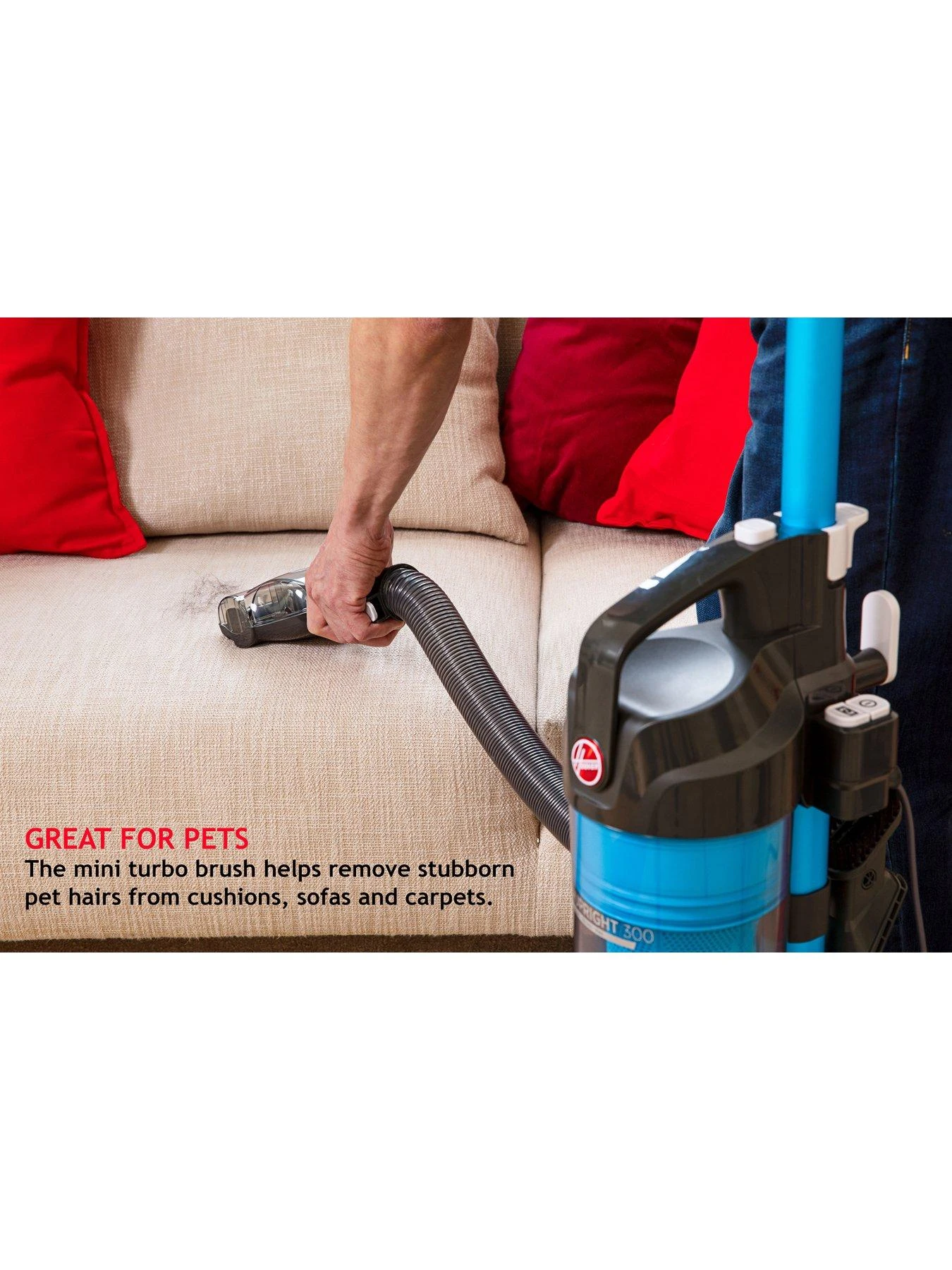 The Hoover Upright 300 Pets vacuum cleaner is a lightweight & multi-cyclonic bagless upright vacuum with no loss of suction. It is extremely steerable and agile, with a swivel floor nozzle and has a H13 HEPA filter for allergy care. This pets upright comes with a mini turbo brush to help remove stubborn pet hairs from cushions, sofas and carpets. The rotating bristles penetrate deeply into the fabric to loosen the fur and vacuum it into the dust collection chamber.