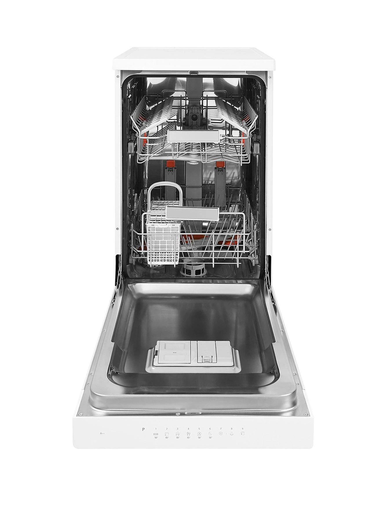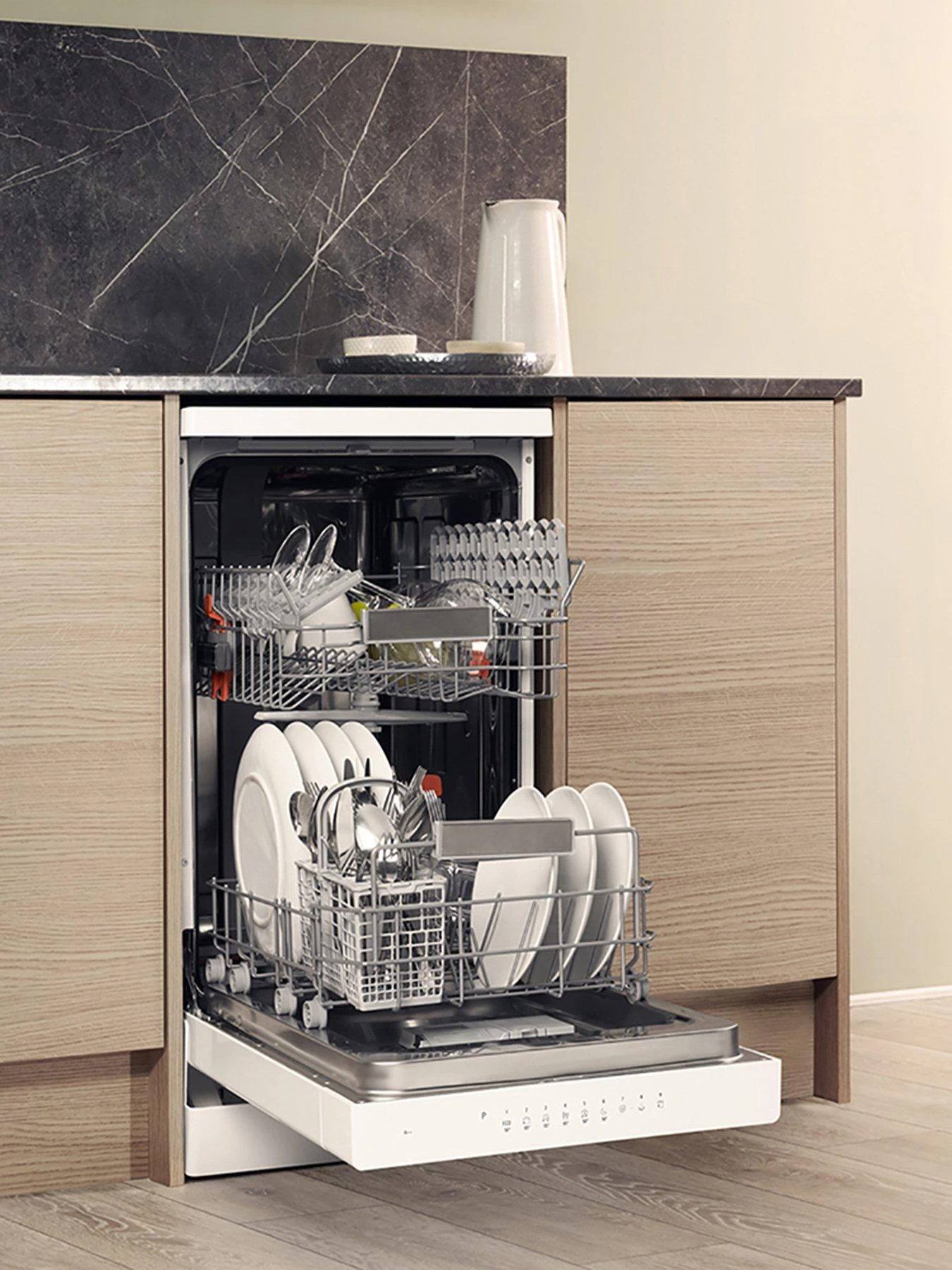 Only 45cm wide, the Hotpoint Clover HSFO3T223WUKN Dishwasher is designed for compact kitchens and smaller households but still has room for lots of cutlery, crockery and pans experience and provides a superior level of clean. With capacity for 10 place settings and a dedicated cutlery tray, this sllimline dishwasher will save you from long stints at the sink.