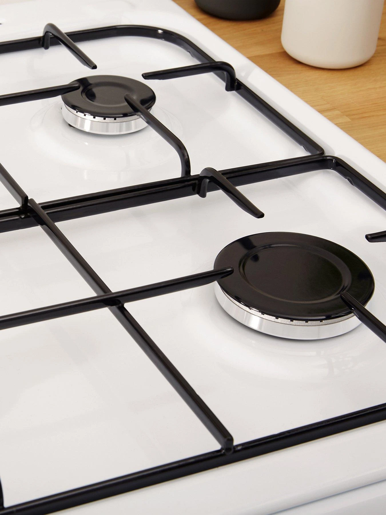 The hob has 4 gas burners, with 3 in different sizes to suit a variety of pan sizes, and easy-clean enamel pan supports, as well as a Flame Safety Device to give you peace of mind. The large 61-litre oven comes with easy clean enamel linings, a double glazed door that protects your fingers from the heat, while the top cavity houses the grill.