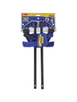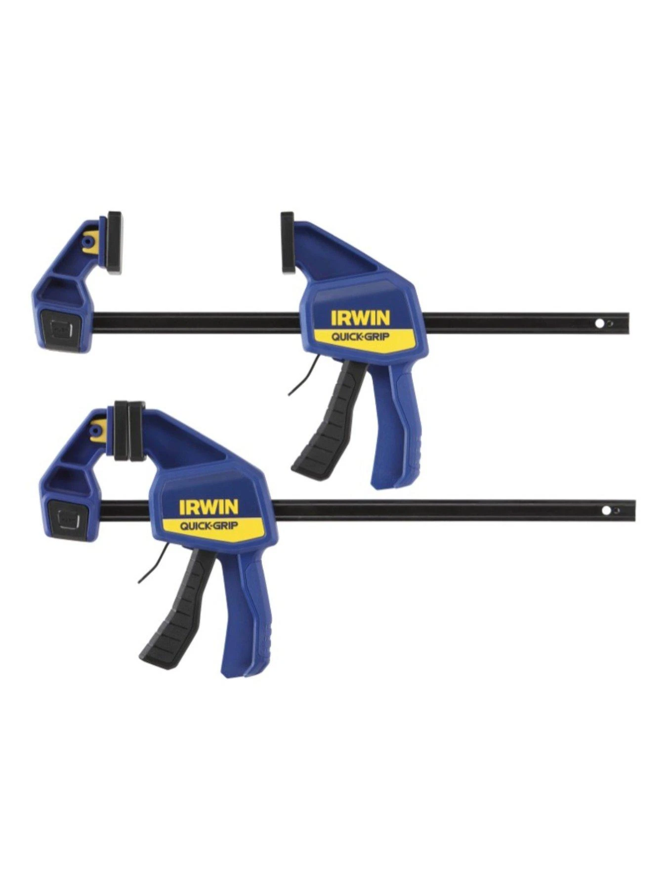 The set of 2x IRWIN QUICK-GRIP® Medium-Duty One Handed Bar Clamps 300mm evenly distributes up to 136kg of sustained clamping force. The heat treated black oxide carbon steel I-beam bar supports the added pressure with less bending and flexing. The quick-change button allows for easy removal of jaws for optional accessory installation or conversion to spreader. The removable swivel jaws and non-marring full face pads protect the work surfaces during application. Ideal for temporary hold-down, quick clamping applications.