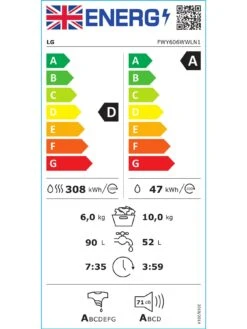 Laundry duty just got a lot easier – the LG FWY606WWLN1 Washer Dryer is packed with exclusive features only found in LG’s machines. Newly designed TurboWash can power through a half load washing cycle in just 39 minutes, without sacrificing wash quality. LG’s unique AI Direct Drive feature automatically detects the characteristics of clothes within your laundry and calculates the optimal drum movement improving fabric care, with AI Wash improving upon previous model quality. In addition, LG’s unique Steam technology allows you to go one step further, offering a hygienic clean by eliminating 99.9% of allergens found in your clothes, approved by the British Allergy Foundation. For added convenience, the inclusion of a dryer function allows the FWY606WWLN1 to complete the entire laundry cycle without the need for interference and also now boasts a bigger drum in the same sized body, letting you tackle more clothes than ever in a single cycle. Refinement to the courses mean this model uses 10% less energy than the threshold for A energy rating during the Eco wash, and now achieves a D energy rating for the full wash-to-dry cycle.