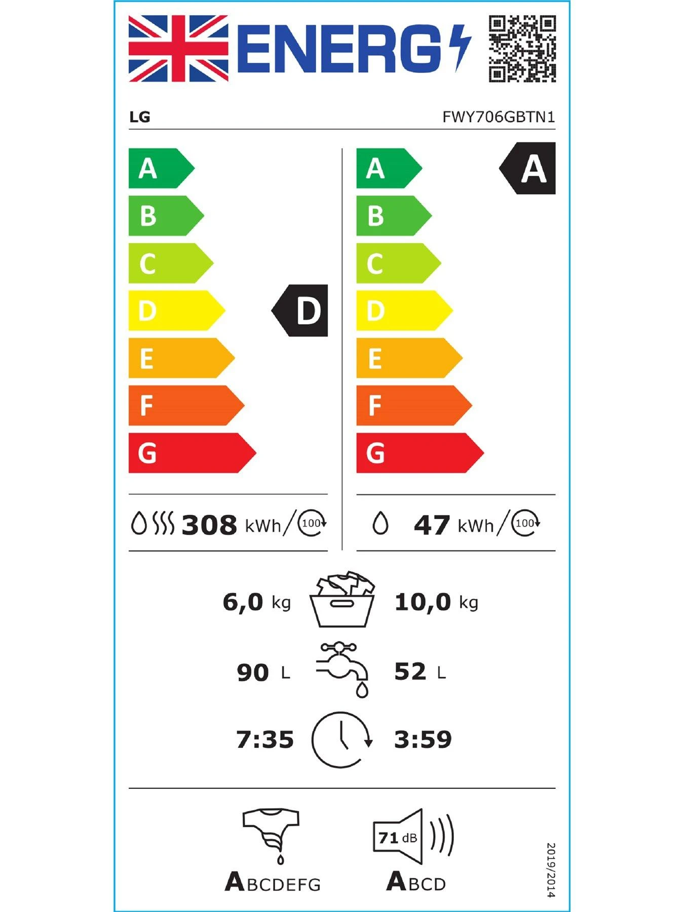 Laundry duty just got a lot easier – the LG FWY706GBTN1 Washer Dryer is packed with exclusive features only found in LG’s machines. TurboWash360 can blitz through a 5kg load washing cycle in just 39 minutes, without sacrificing wash quality. LG’s unique AI Direct Drive feature automatically detects the characteristics of clothes within your laundry and calculates the optimal drum movement improving fabric care, with AI Wash improving upon previous model quality. In addition, LG’s unique Steam technology allows you to go one step further, offering a hygienic clean by eliminating 99.9% of allergens found in your clothes, approved by the British Allergy Foundation. For added convenience, the inclusion of a dryer function allows the FWY706GBTN1 to complete the entire laundry cycle without the need for interference and also now boasts a bigger drum in the same sized body, letting you tackle more clothes than ever in a single cycle. Refinement to the courses mean this model uses 10% less energy than the threshold for A energy rating during the Eco wash, and now achieves a D energy rating for the full wash-to-dry cycle.