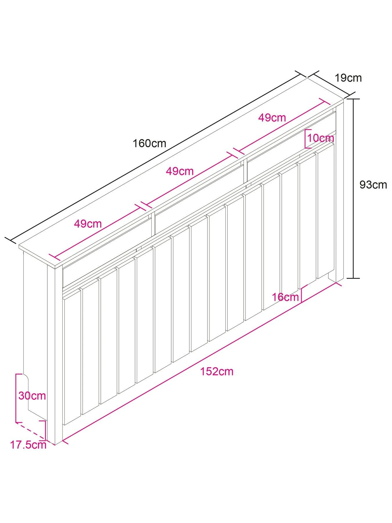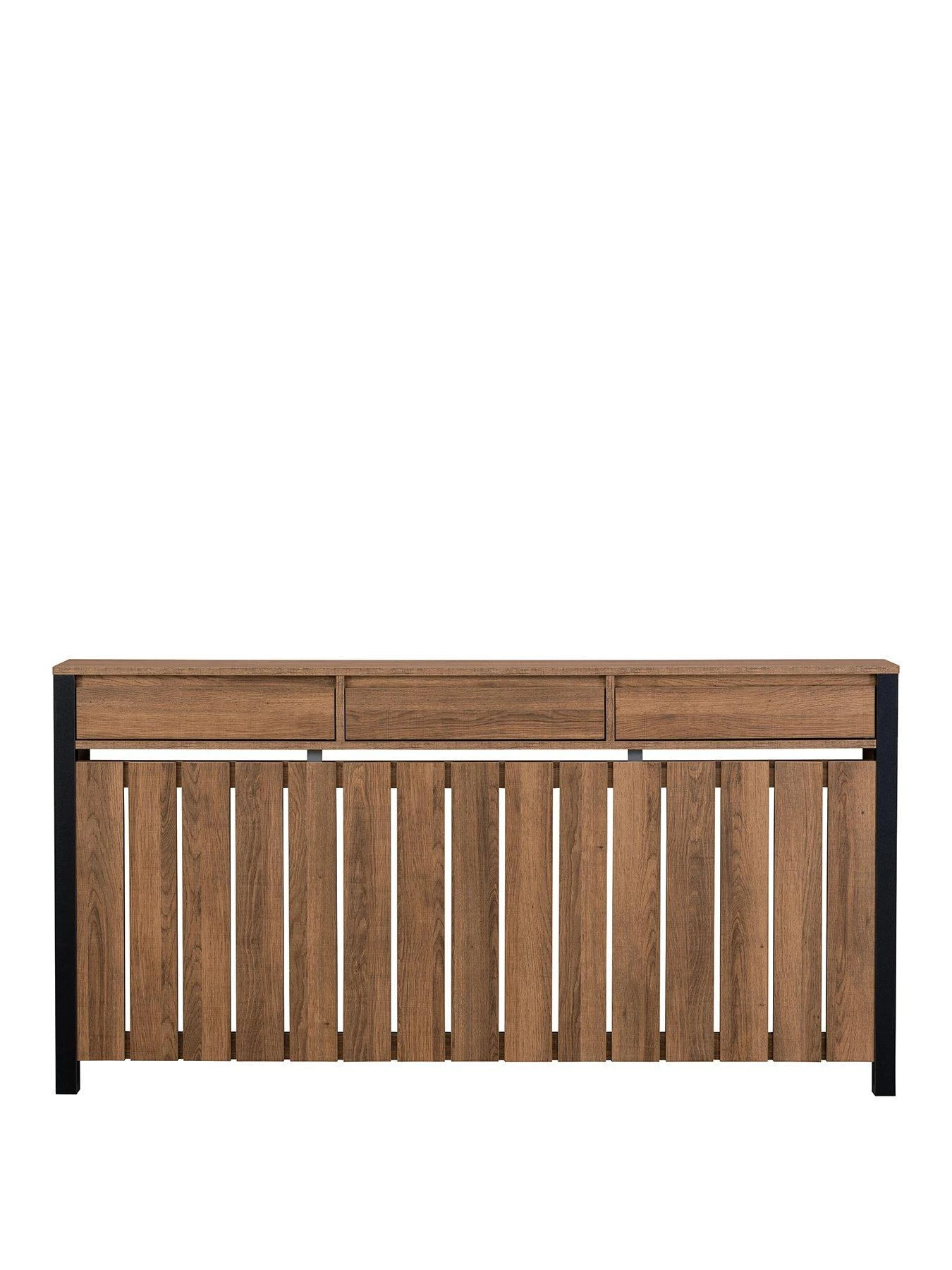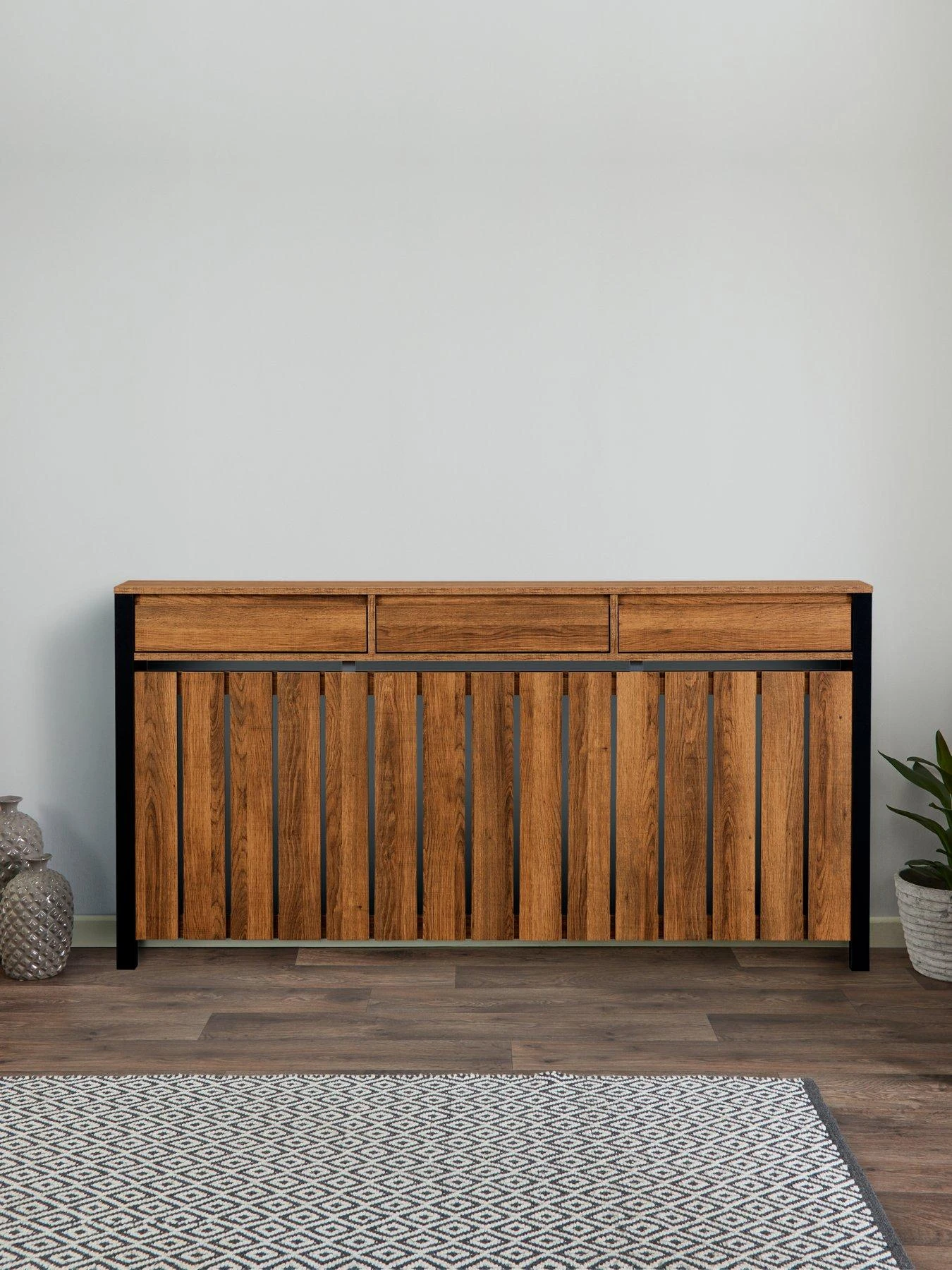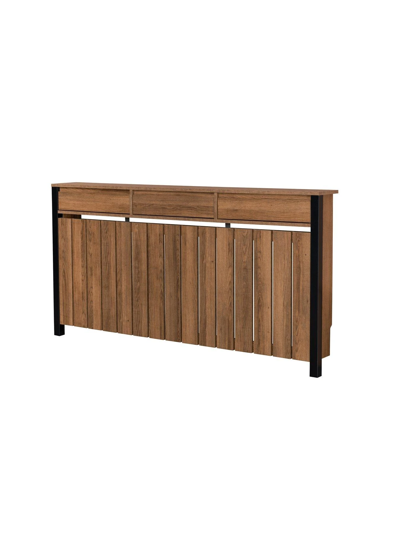 Transform any room and add an industrial feel to your interior style with the Large Radiator Cover. Featuring an all-over wood effect with metal trims, this cover has three shallow top drawers making for a handy storage solution, hiding radiators out of sight and protecting them from accidental burns. Available in Small, Medium and Large.