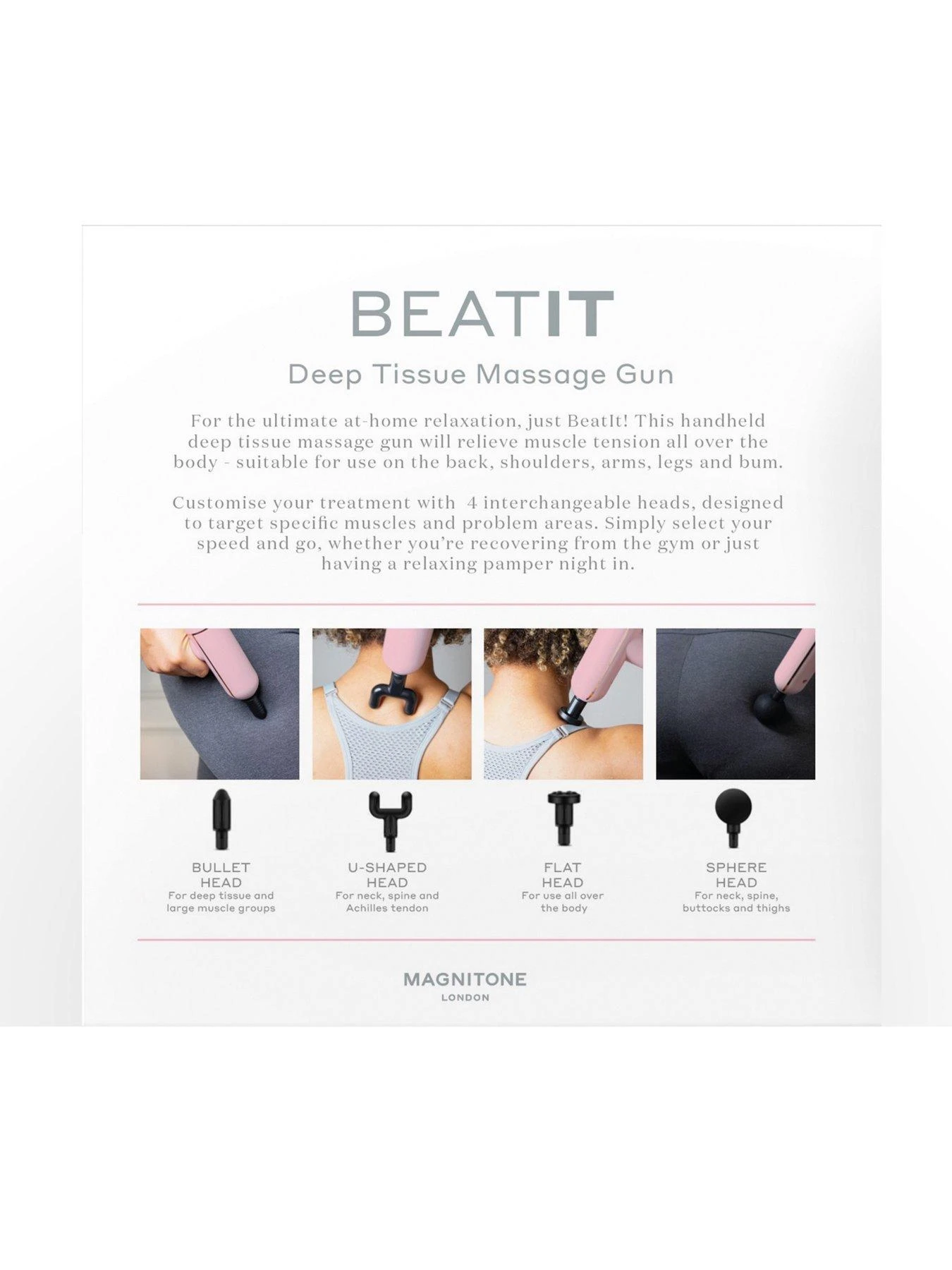 TheĀ Magnitone BeatĀ It Deep Tissue Massage Gun has 4 interchangeable heads, to ensure that every part of your body is properly treated.