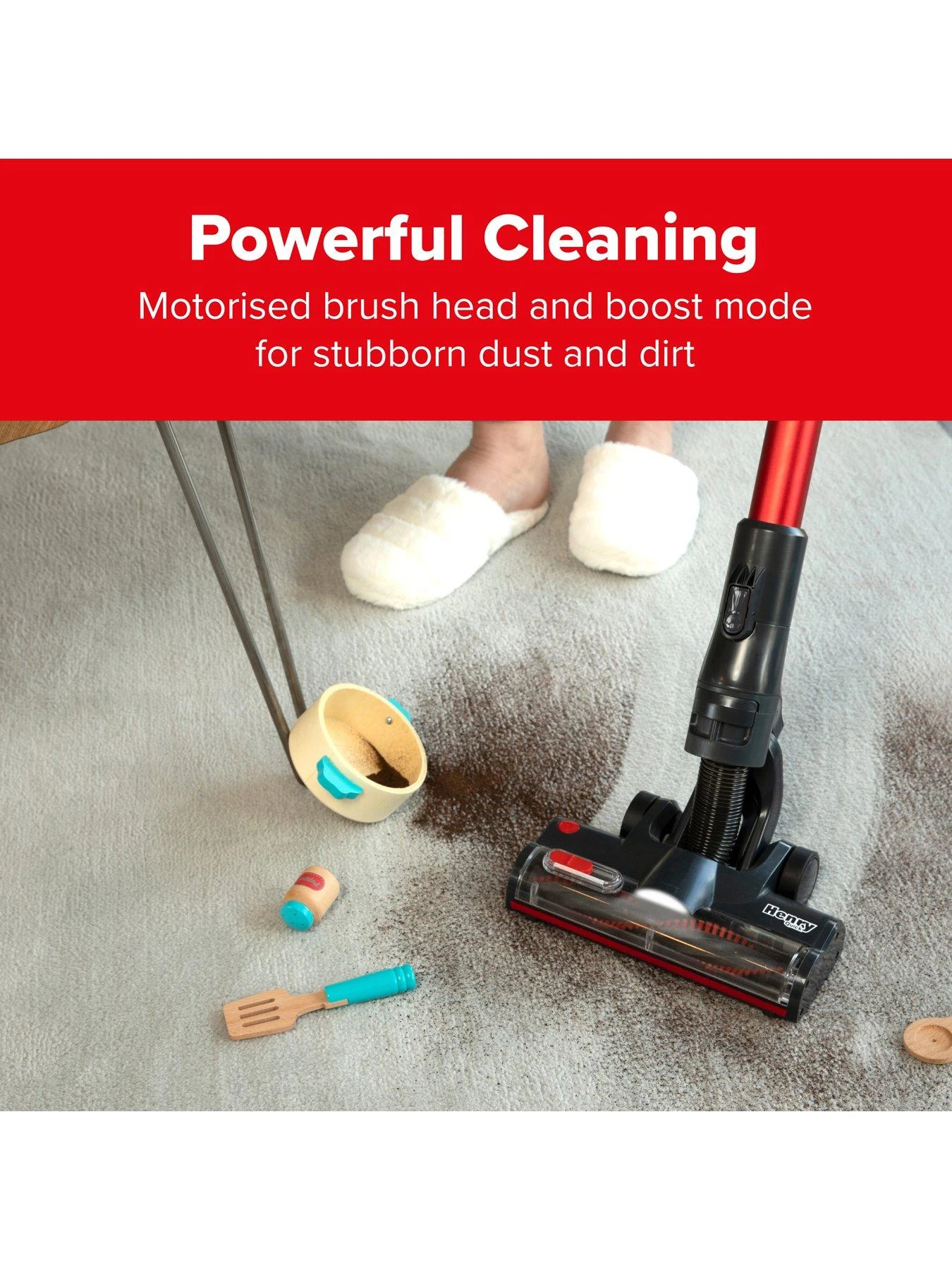 - Henry Quick’s powerful, motorised brush head easily tackles stubborn dust, dirt and pet hair on carpets, hard-floors, stairs and furniture