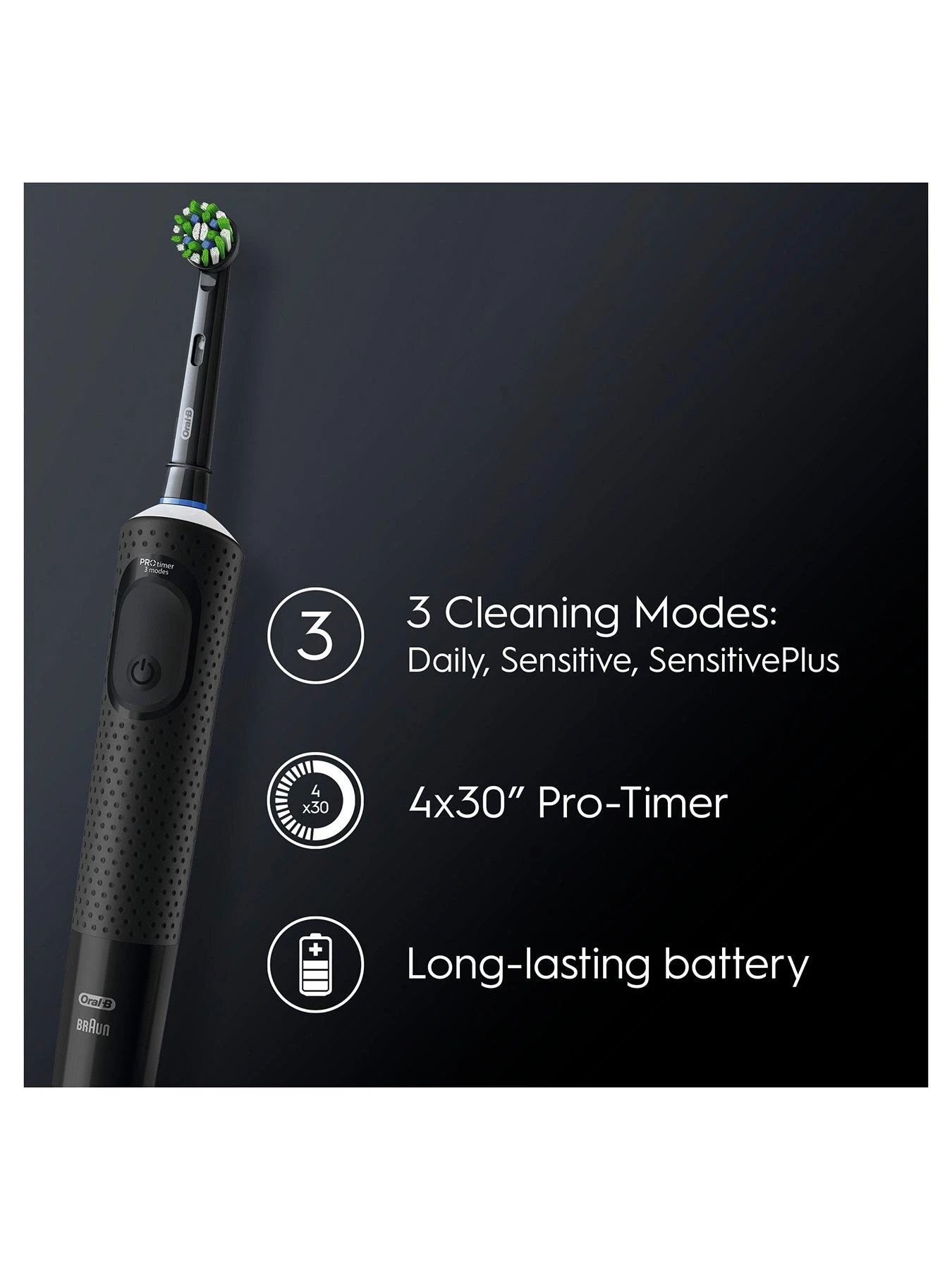 The Oral-B Vitality Pro electric rechargeable toothbrush provides a clinically proven superior clean vs. a regular manual toothbrush. The toothbrush comes 3 brushing modes: daily clean, sensitive and sensitive plus mode for an amazingly gentle experience. An in-handle timer helps you brush for a dentists-recommended 2 minutes. Best of all it’s brought to you by Oral-B – the no.1 brand used by dentists worldwide.