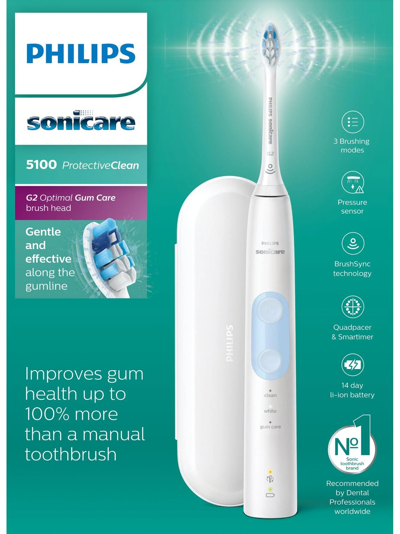 Unique sonic technology drives fluid deep between teeth along with our specially designed brush heads to gently but effectively remove plaque in-between teeth and along the gum line. Simply brush with our Philips Sonicare ProtectiveClean 5100 for 2 minutes twice a day for increased plaque removal for healthier teeth and gums in just 2 short weeks (vs a manual toothbrush).