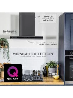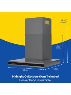 Smarten up your kitchen with this Midnight Chimney Cooker Hood. Part of the premium Midnight Collection range, this sleek T-shaped model is designed to fit seamlessly into your kitchen. The modern dark steel accents, combined with efficient functionality, makes this the perfect addition to any contemporary household.