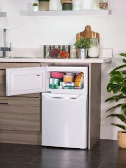 The slimline 48cm fridge-freezer is designed to slot seamlessly into your home, and still provide you with plenty of storage for fresh food and treats. The fridge space features 2 handy glass shelves, which can be removed if you ever need space for larger items. The two fixed door racks are ideal for taller drinks cartons and bottles.