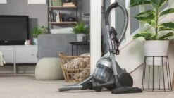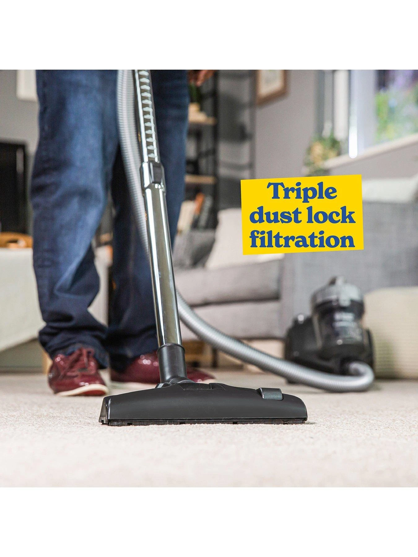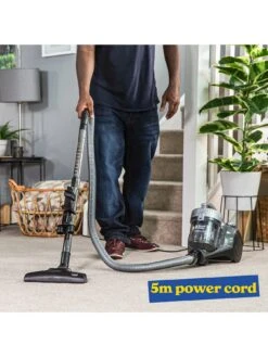 This cylinder vacuum boasts a Triple Dust-Lock filtration system including a HEPA filter, easy to empty dust canister, and a high efficiency 700W motor that has the potential to help save money on your electricity bills. It has an 8m cleaning radius including a 5m power cord, so you’ll rarely be out of reach of a plug socket.