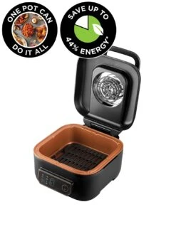 It has seven cooking options so you can cook with confidence, whether your air frying, roasting, baking, slow-cooking, searing, grilling or simply keeping meals warm. With little or no oil required, you can reduce the amount of fat you use without compromising on taste.