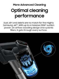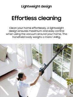 Clean your home effortlessly with easy control and movement. A lightweight vacuum cleaner design ensures maximum usability and reduces the strain on your wrist. As the handheld body weighs just 1.44kg making it 13% lighter*, cleaning your home with a Samsung vacuum cleaner means you get a deep clean.