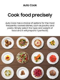 Auto Cook has a choice of options for the most frequently cooked dishes, such as poultry and pasta. Each is pre-programmed with the optimal mode, time and temperature. Simply select the type and weight of food and it will prepare it perfectly.