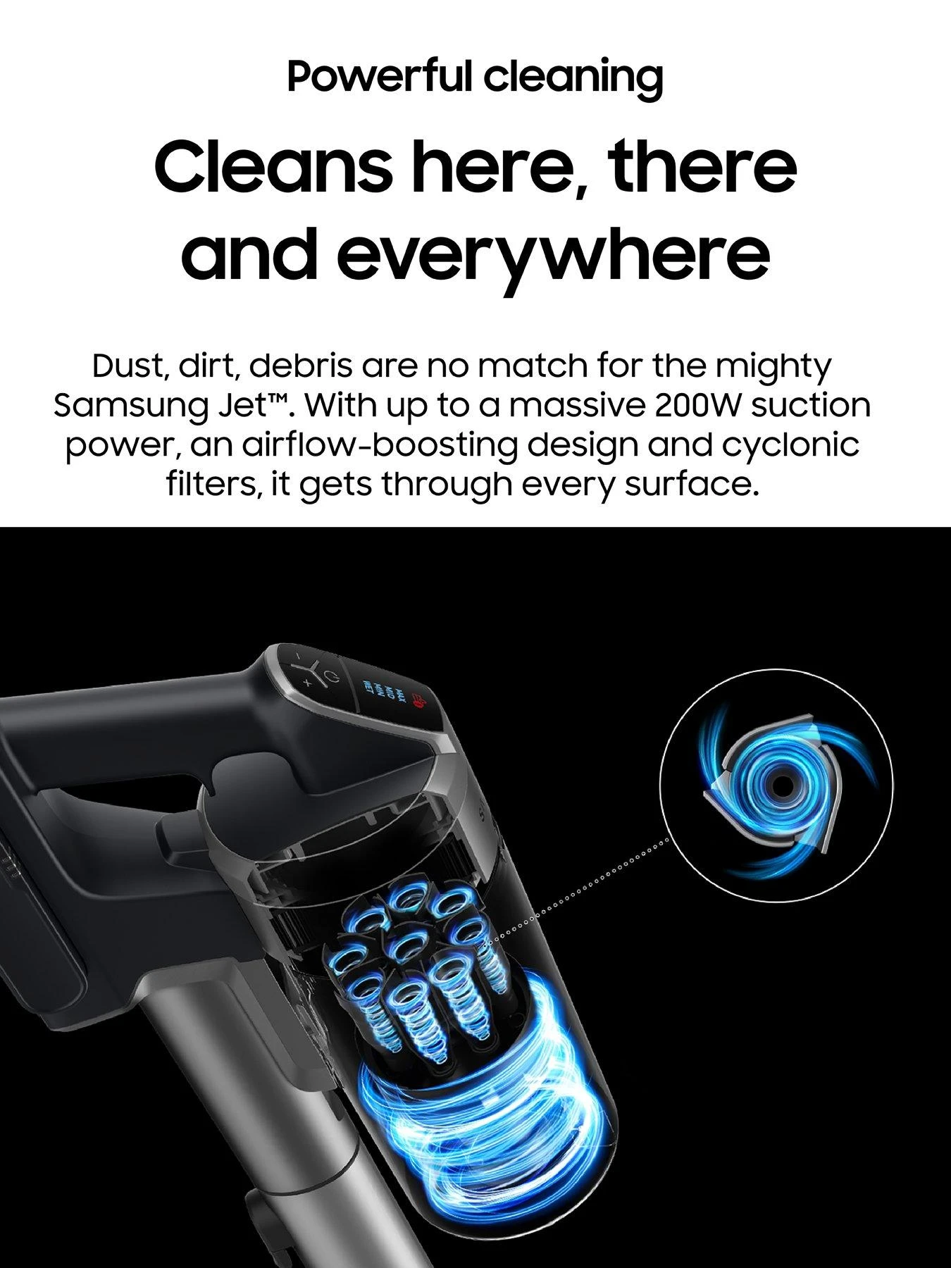 With up to a massive 200W** suction power, an airflow boosting design and cyclonic filters, it gets through every surface.