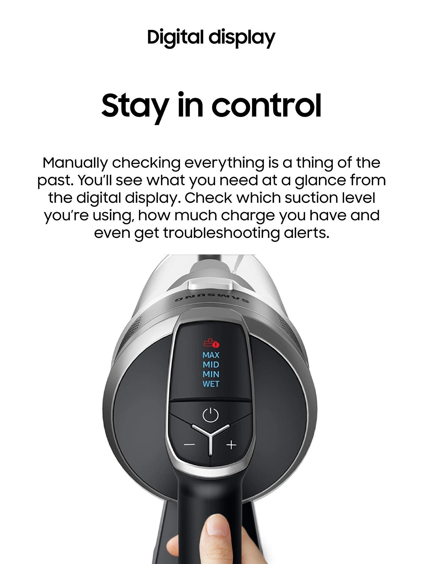 With a handy digital display you’ll see what you need at a glance from which suction level you’re using.