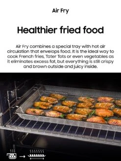 Enjoy healthier fried food without a deep fryer. Air Fry combines a special tray with hot air circulation that envelops food. It is the ideal way to cook French fries, Tater Tots or even vegetables as it eliminates excess fat, but everything is still crispy and brown outside and juicy inside.