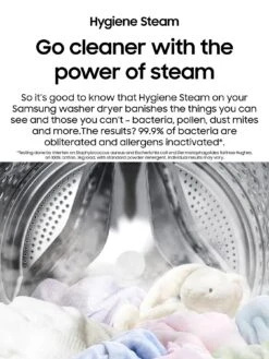 Banish more than just stains and odours. The Hygiene Steam cycle on your Samsung washing machine releases hot steam, eliminating 99.9% of bacteria and inactivating allergens*.