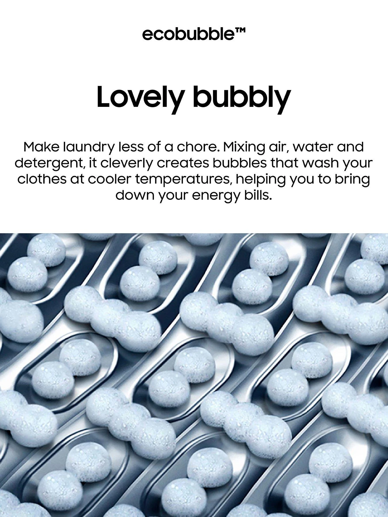 Ecobubbleâ„¢ technology features a bubble generator that dissolves detergent into the water and then injects air, producing a rich soapy foam cushion that doesn’t need as much hot water to aid cleaning, while using just 30% of the energy of a standard wash. Keep all your clothes vibrant and smart with really effective cleaning while saving money on your electricity bill at the same time, thanks to an EÂ rating for energy efficiency.