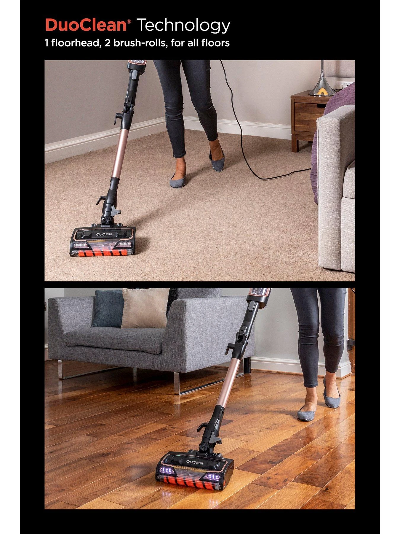 with the versatile DuoClean floorhead. Two motorised brush-rolls work together to clean carpets and hard floors, with no need to stop or change floorheads.. A bristle brush-roll cleans deep into carpet pile while a soft front brush-roll draws in large debris and small particles and lifts fine, stuck-on dust from hard floors. Great for homes with a mix of floor types.