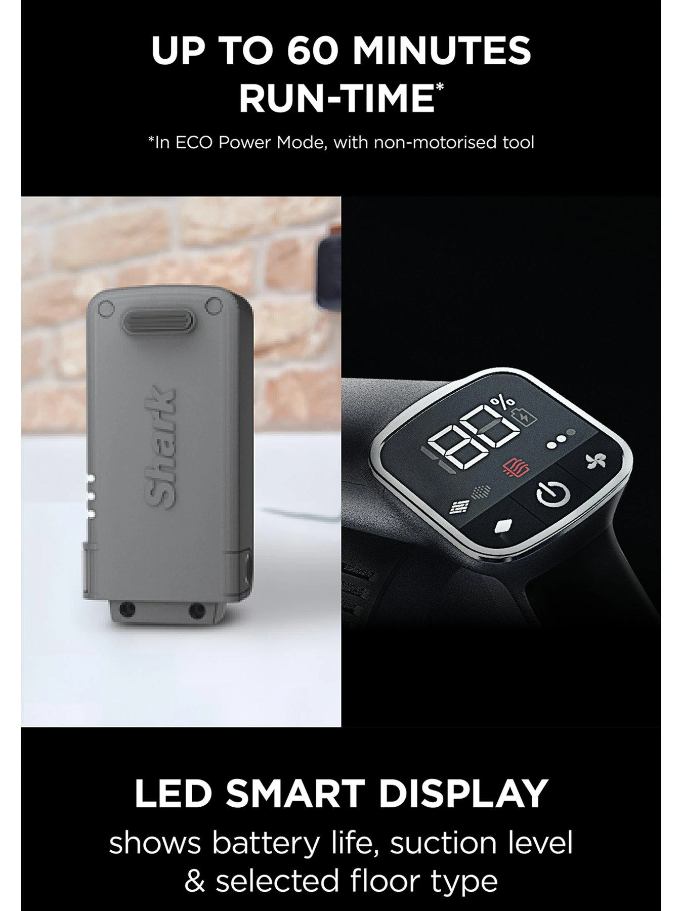 An easy-to-read LED Smart Display screen on the handle displays battery life, suction level and selected floor type.