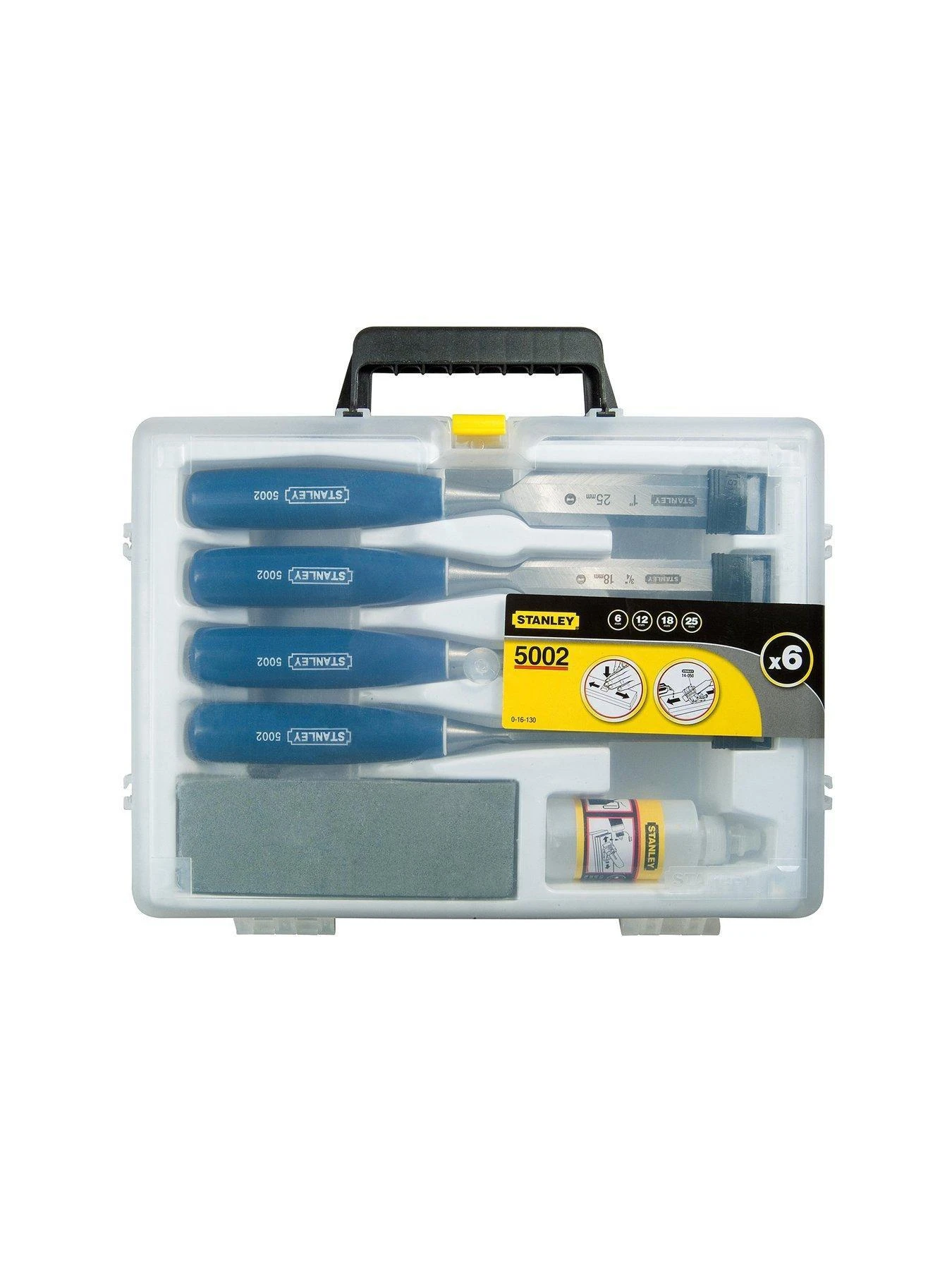 This Stanley 6-piece chisel set includes 4 chisels, oil and a stone which come in a carry case for easy storage.